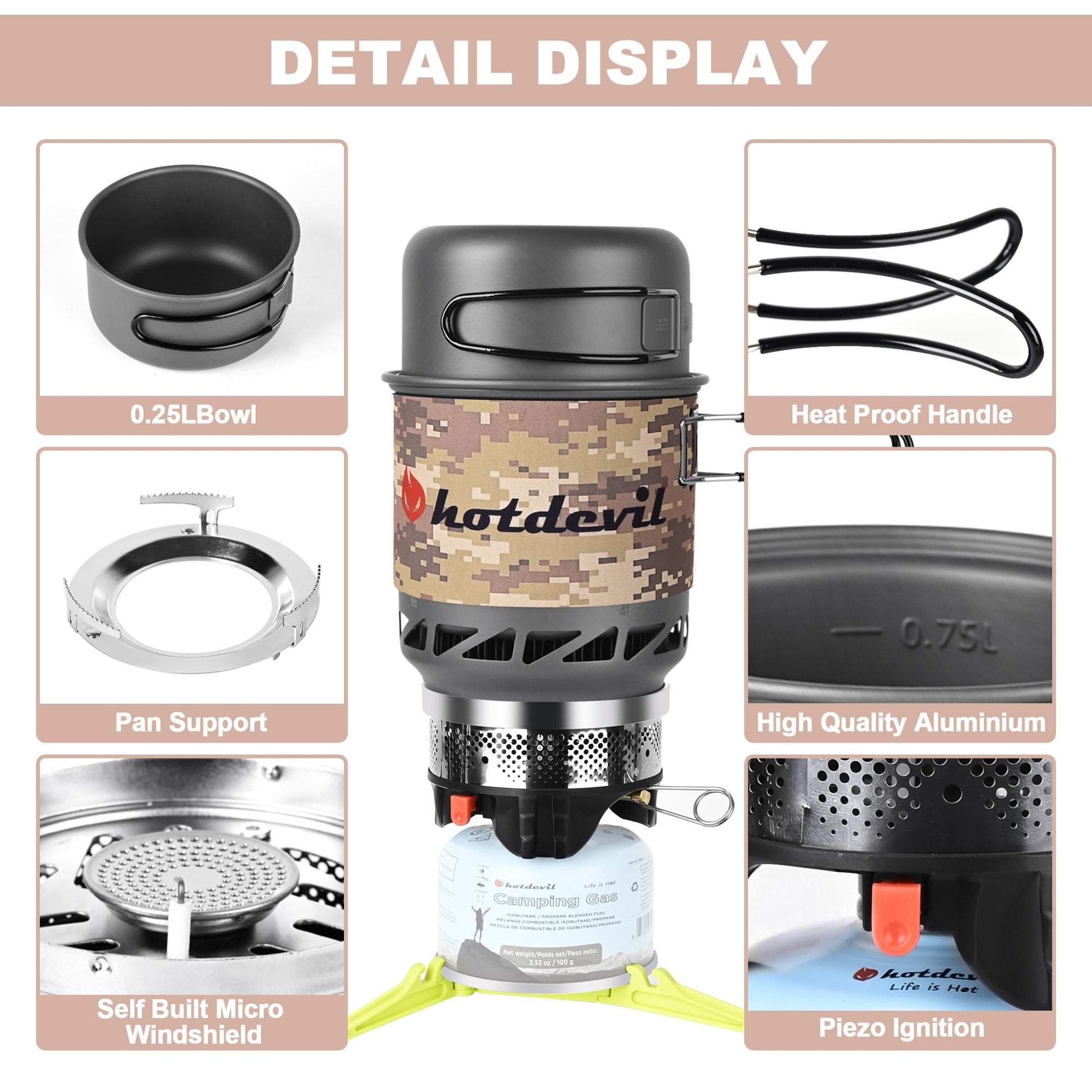 0.75+0.25L Backpacking Camping Stove Cooking System with Piezo Ignition, Outdoor Portable Burner with Pot & Metal Holder Camping Stove Kit Propane, Ideal for Hiking Fishing Hunting Emergency