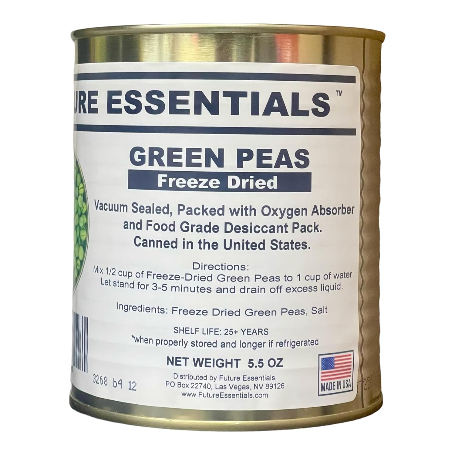 #2.5 Can / 5.5 oz Future Essentials Freeze Dried Green Peas reconstitute on a scale of 1 lb : 4.5 lb Shelf Life: 25+ years under ideal storage conditions. Ingredients: Freeze Dried Green Peas.