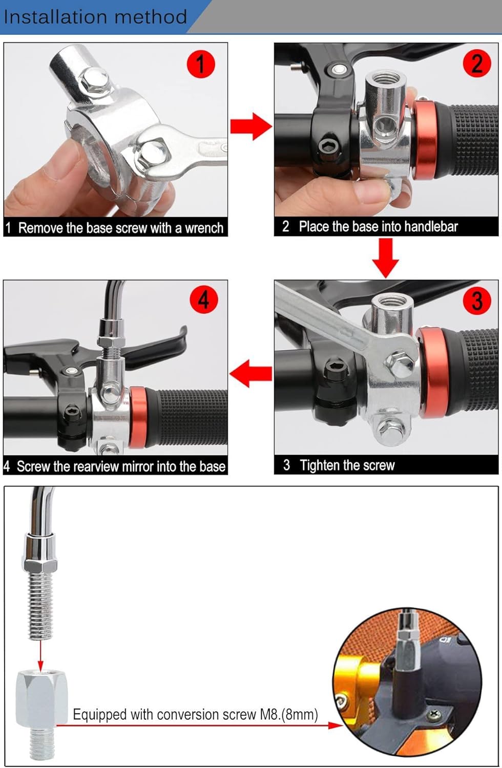 Package: 2 mirrors + 2 Handlebar clamps+2 Conversion nut