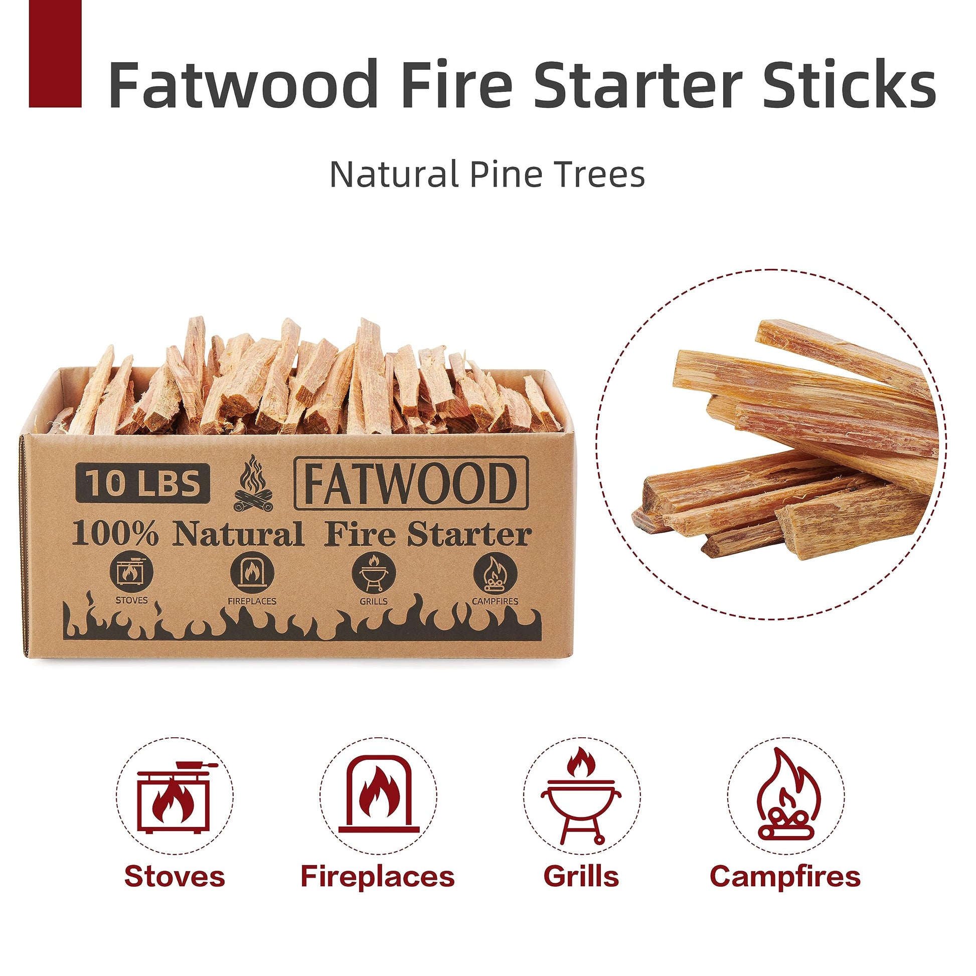 - Quick & Easy Fire Starting: All you need is 2-3 sticks of fatwood placed at the center of your kindling. It lights up fast, saving you from struggling with other methods.(Around 200 sticks per box)