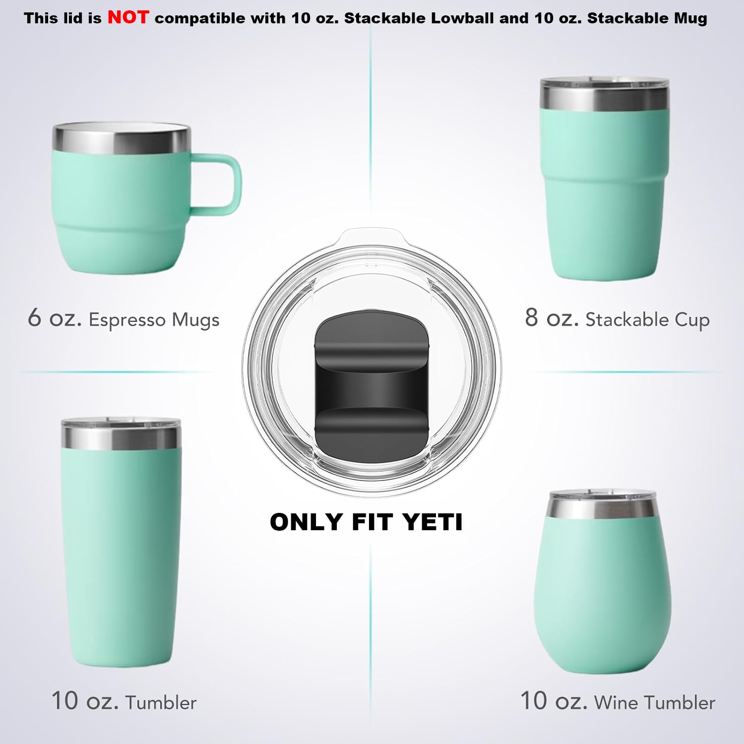 - PERFECT REPLACEMENT: This magnetic cup lid is ONLY compatible for YETI 10 oz Tumbler, 6 oz Espresso Mugs, 8 oz Stackable Cup and 10 oz Wine Tumbler. (Note: This lid is NOT compatible with 10 oz. Stackable Lowball and 10 oz. Stackable Mug)