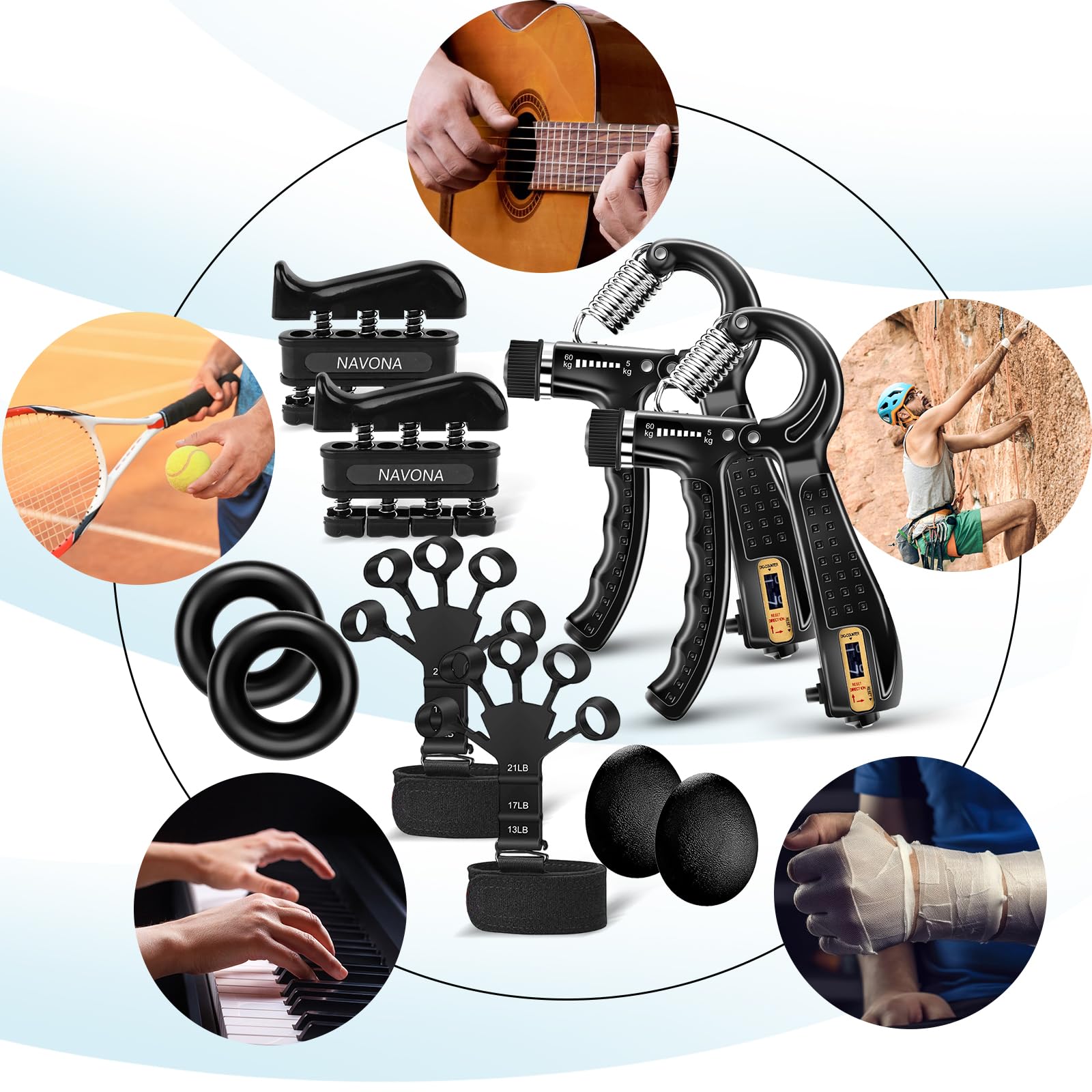 - 【For Fitness & Sport Enthusiasts】- This grip trainer kit enables strength training, rehabilitation, sports conditioning, and stress relief. A strong grip is crucial for performance in weightlifting, rock climbing, martial arts, tennis, golf, wrestling, and baseball. Additionally, musicians, especially guitarists, pianists, and drummers, office workers, and seniors can also benefit from using it.