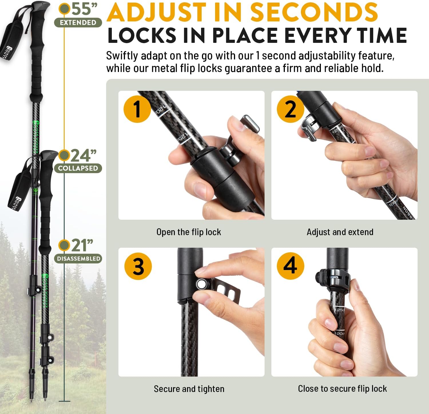 - Premium Stability: With our flip lock lever technology, our hiking poles are easy to adjust & lock in place securely. More secured locking than twist lock or foldable poles that slide out. And we use metal locks vs. plastic for ultimate strength.