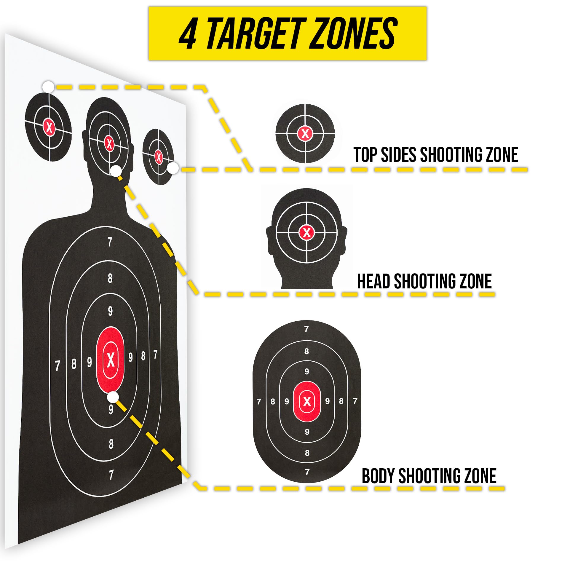 - GUN RANGE TARGETS - 100 premium paper shooting targets with NO WRINKLE NO CREASE, each featuring detailed human silhouettes with 4 shooting zones ''3 heads and center chest''. Four enhanced red target spots for long-range target practice. Our design is to help improve your shooting skills for multiple target situations and long-range accuracy.