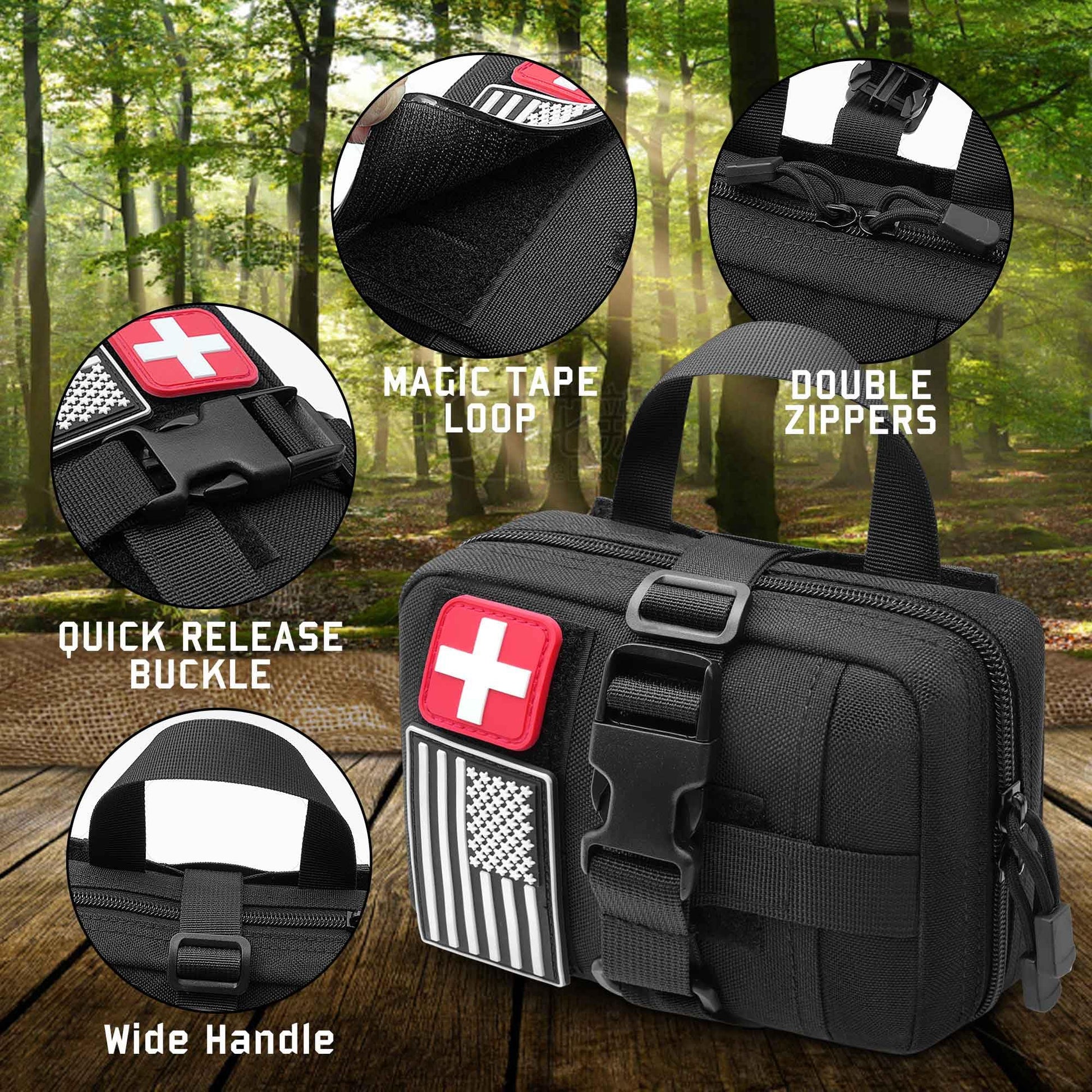 - Open Fully for Easy Access: The molle medical pouch can be built for rapid removel. As a tactical medic pouch, it is easy to tear and take out the required supplies in an emergency.And our ifak pouch has two-way zippers and silent cord pulls, fully opened for accessing the first aid supplies easily once emergencies happen.