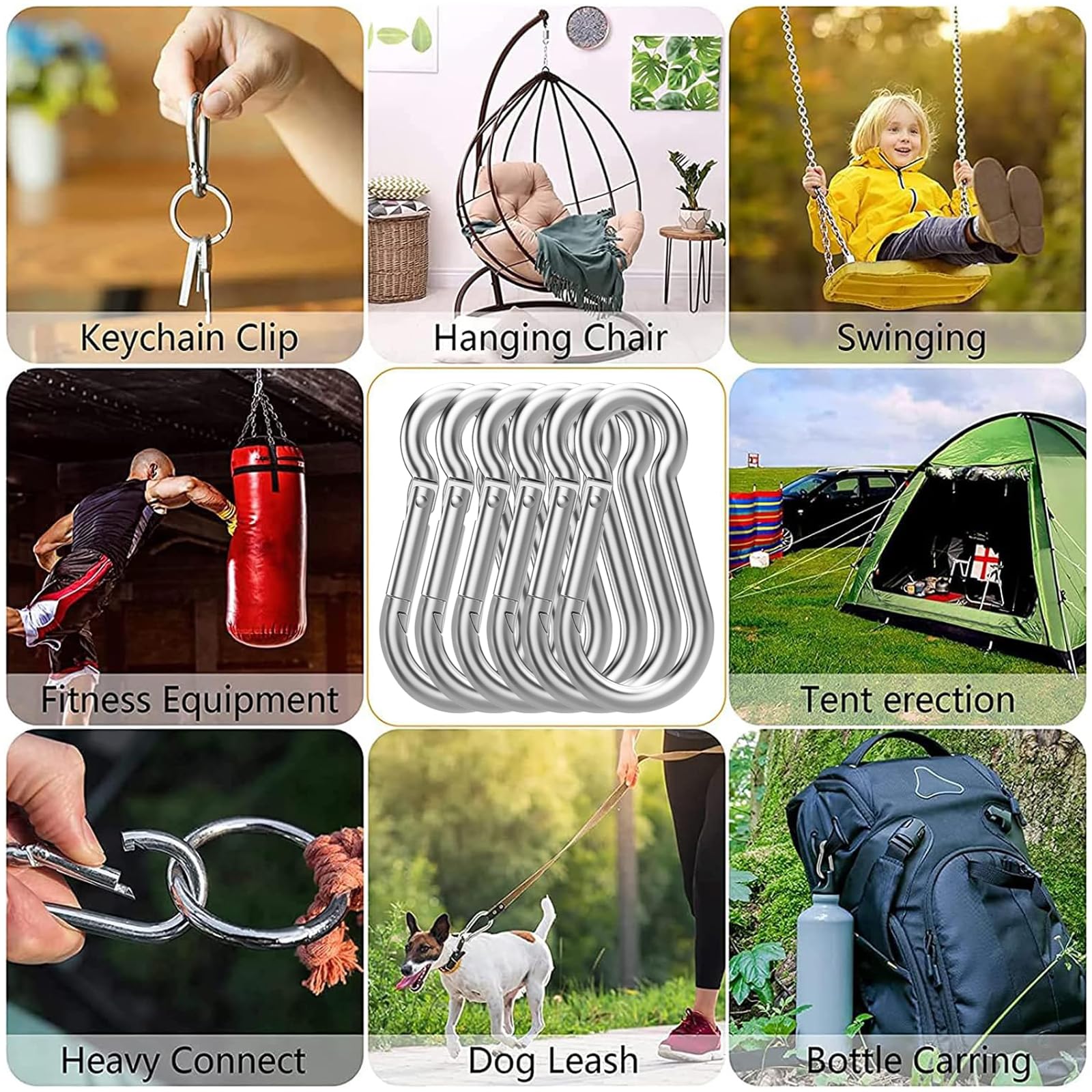 - Versatile and Useful Snap Hooks Carabiner: Snap hook has a wide range of applications, and you can use clips to wall tether for exercising, secure items to a kayak, anchor the attachment point for tent, connect shade sails, set up home gym and so on; In addition, 3.2 inch carabiner clips can be used for flag poles, boating, fishing, hiking, camping, fitness, backpack, chains, ropes, pet