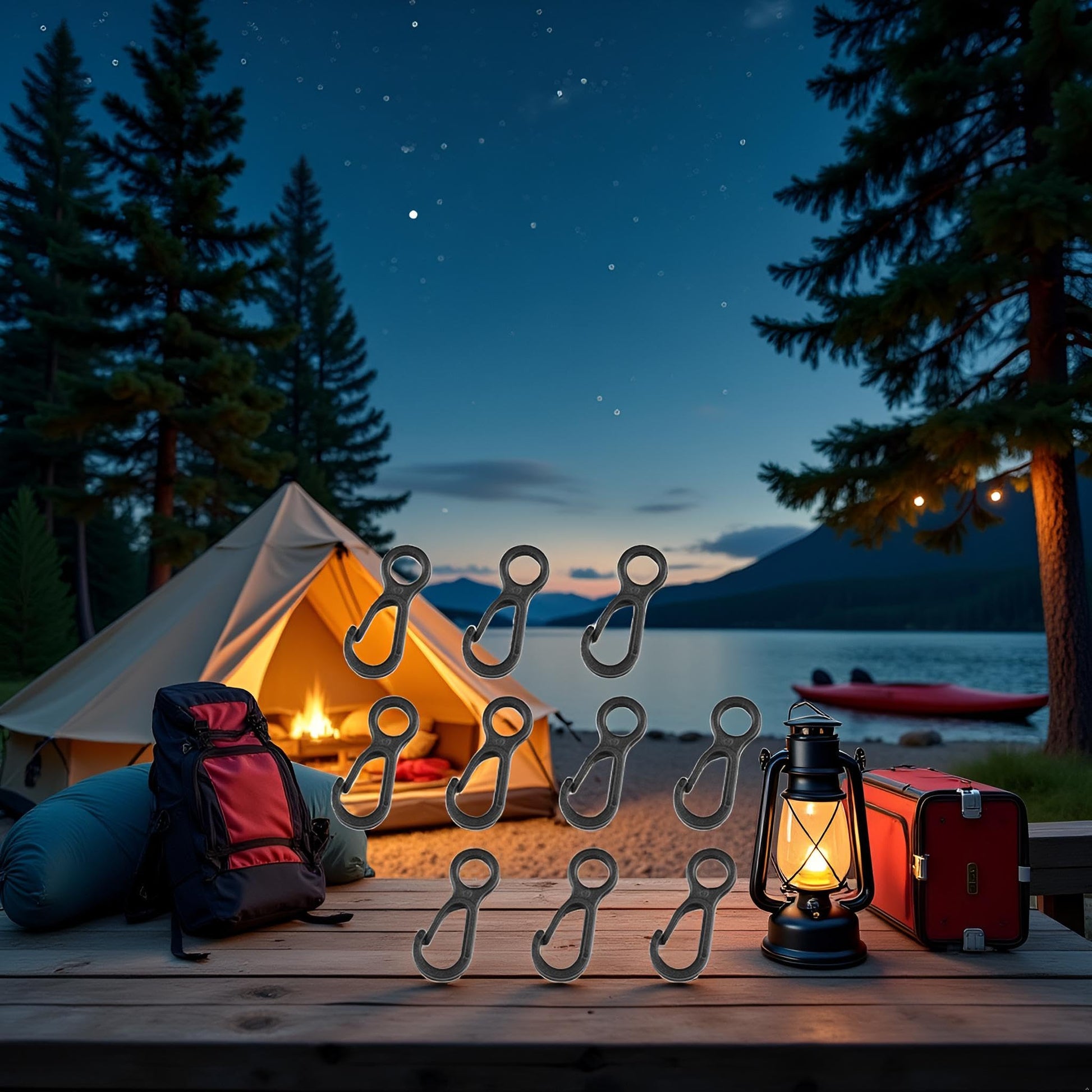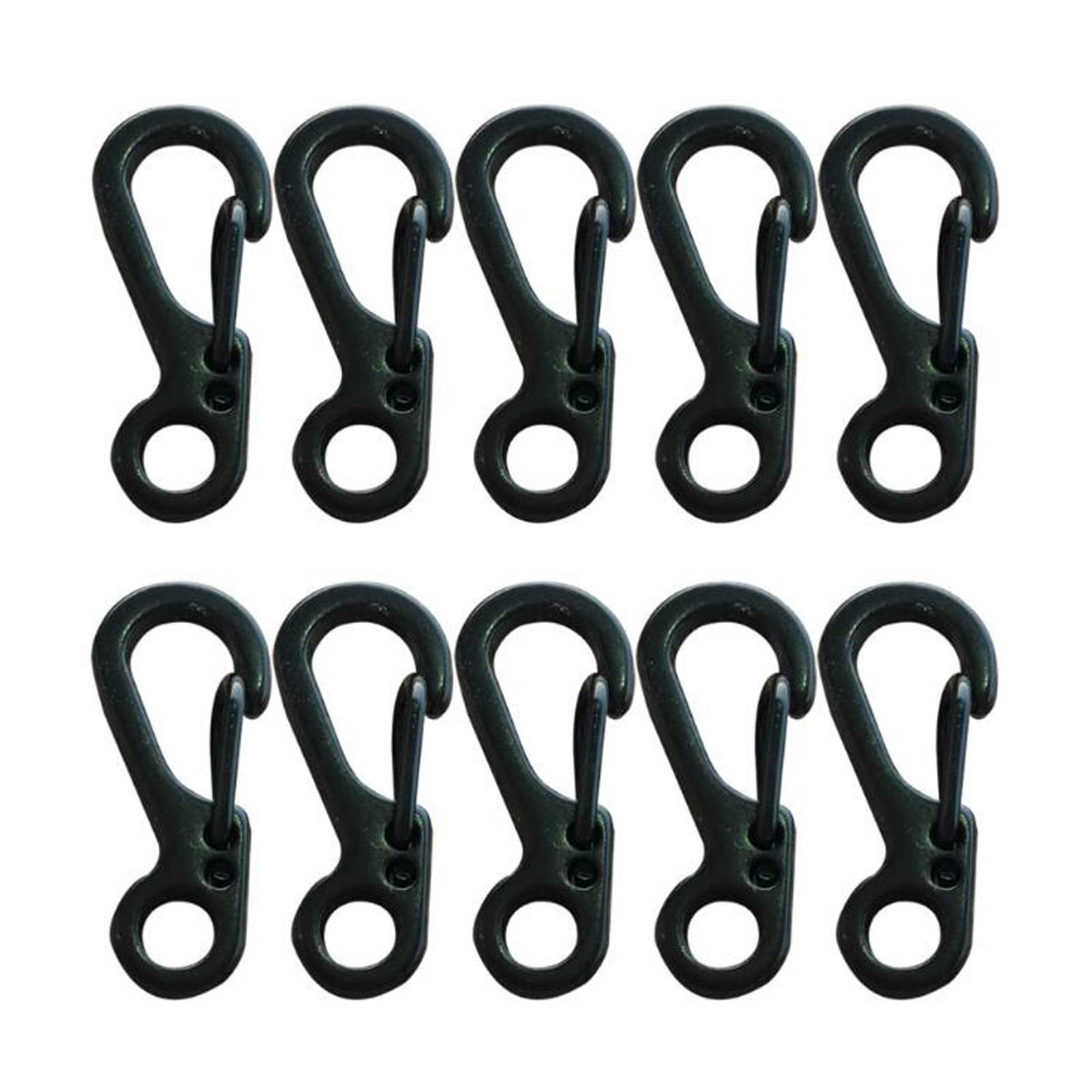 - Versatile: Set of 10 black plastic snap clip carabiners for various outdoor and indoor uses like camping, hiking, hanging lights, and attaching accessories.