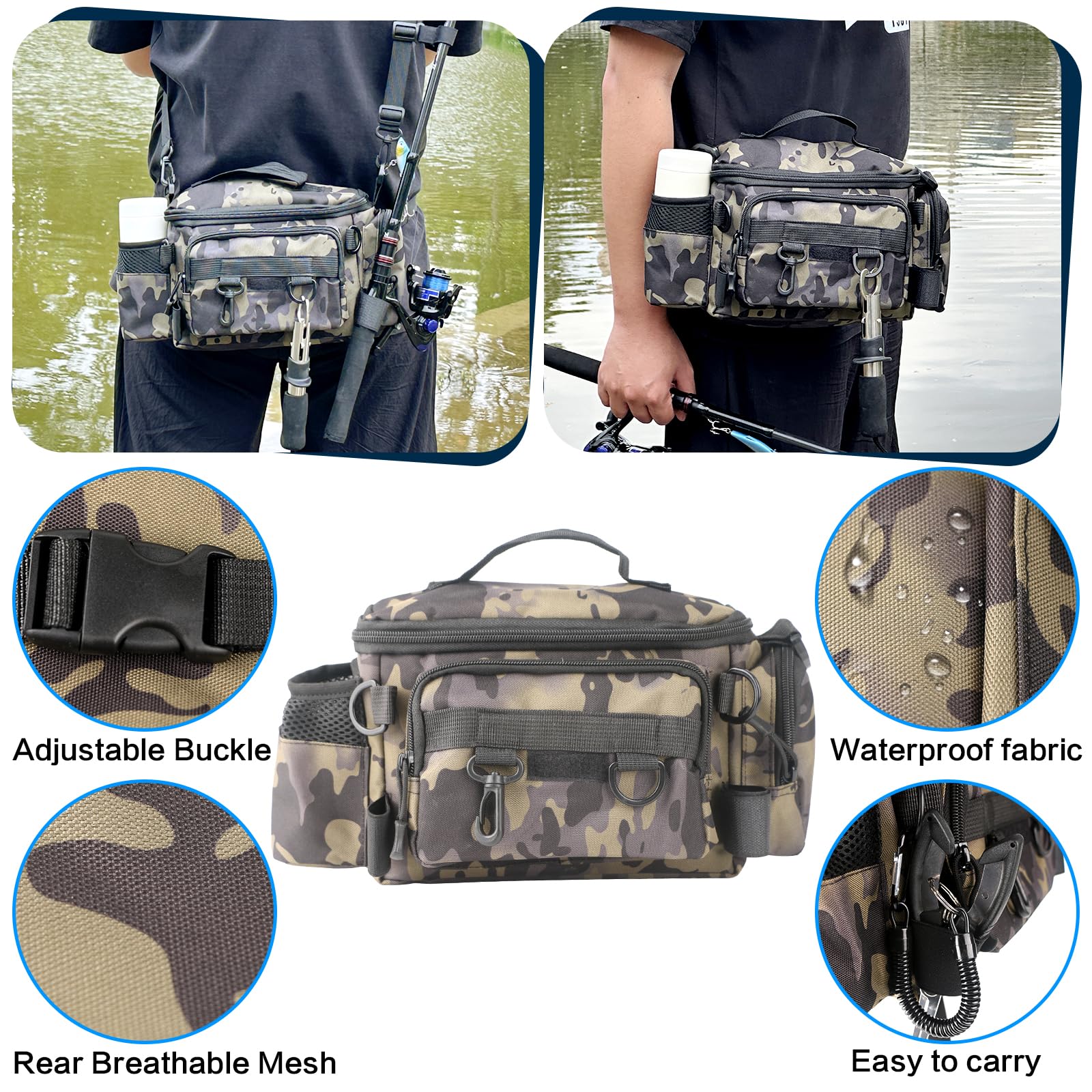 - HIGH-CAPACITY FISHING BAG - Large fishing storage bag is a must-have for any angler, It features a spacious main compartment, convenient side pockets, rod holder straps, multiple D-buckles, providing ample space to organize and store your fishing tools. Stay organized and have easy access to your tackle, improving your preparation efficiency and ensuring a stress-free fishing experience
