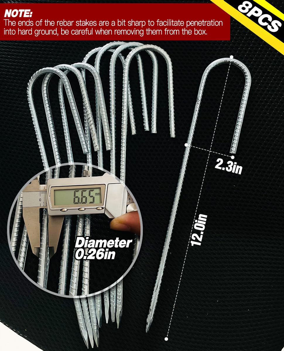 12 Inch Rebar Stakes, 8 Pack Ground Stakes J Hook Tent Stakes Heavy Duty Galvanized Anti-Rust for Camping, Garden Decorations, Drip Tubing, Artificial Turf