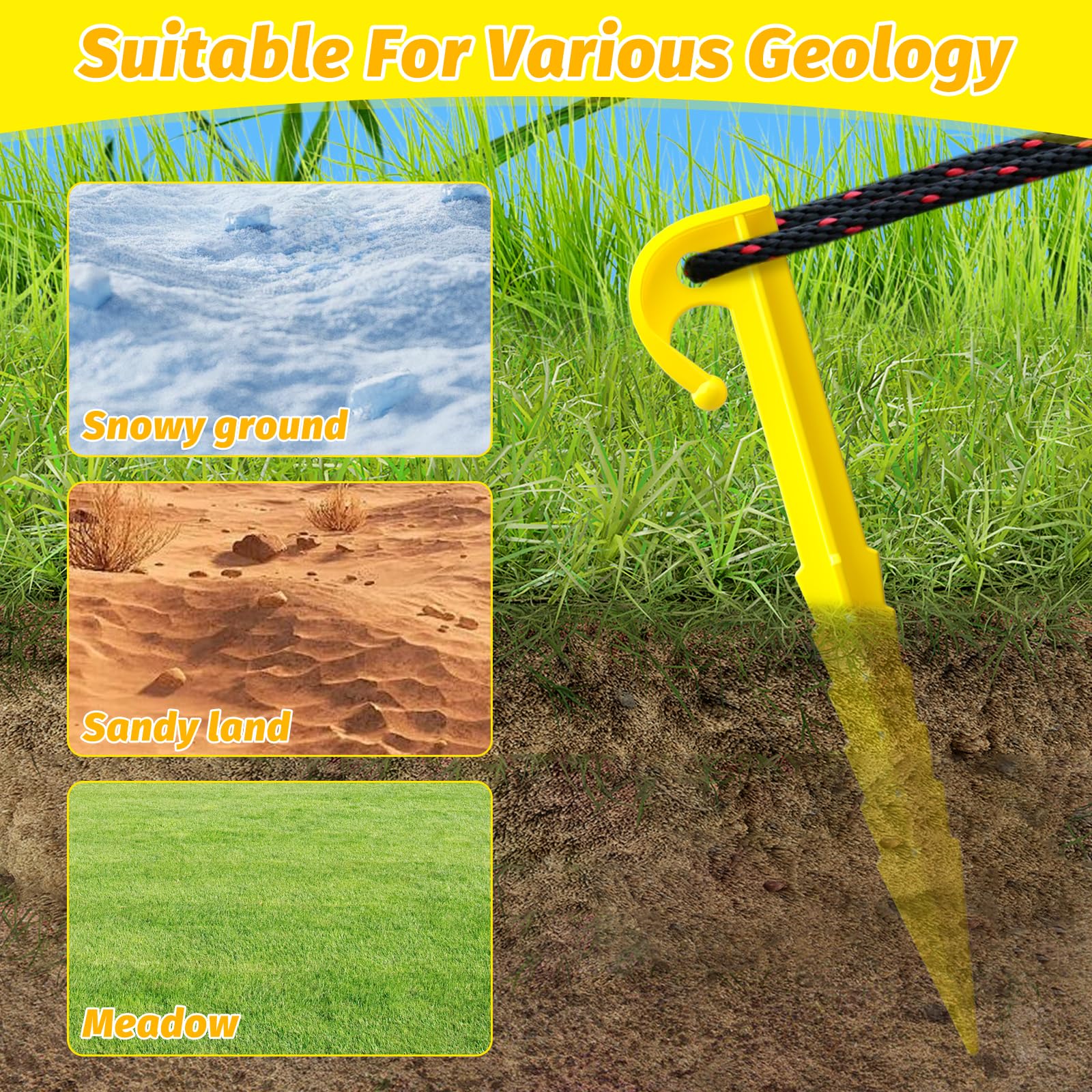 - 【Excellent Value for Money】With 12 pieces of bright yellow plastic tent stakes in each package, you'll have enough to meet your daily needs and replacement requirements. Thanks to their vibrant color, they're easy to spot in tall grass, ensuring a stable and worry-free camping experience.