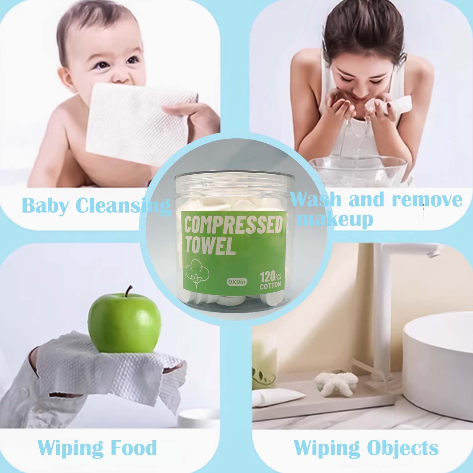 120 Pcs Compressed Towels, 9x9in Fast Expanding Disposable Face & Body Towellets, Portable Camping Towels for Travel, Gym, Outdoor Activities