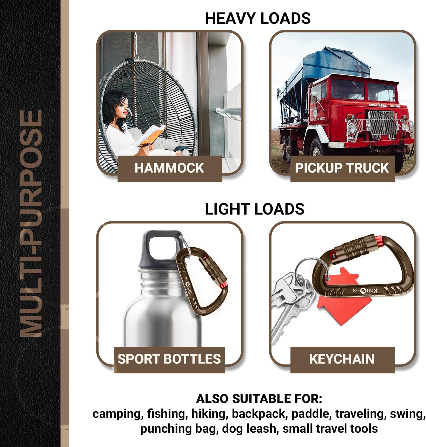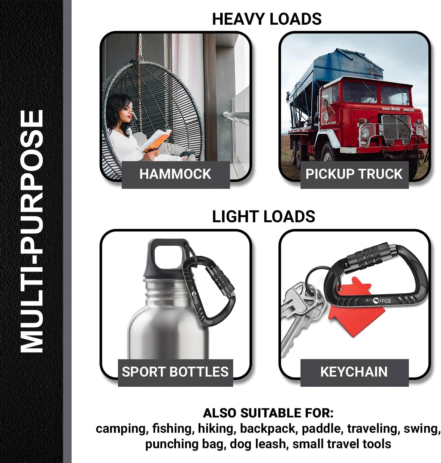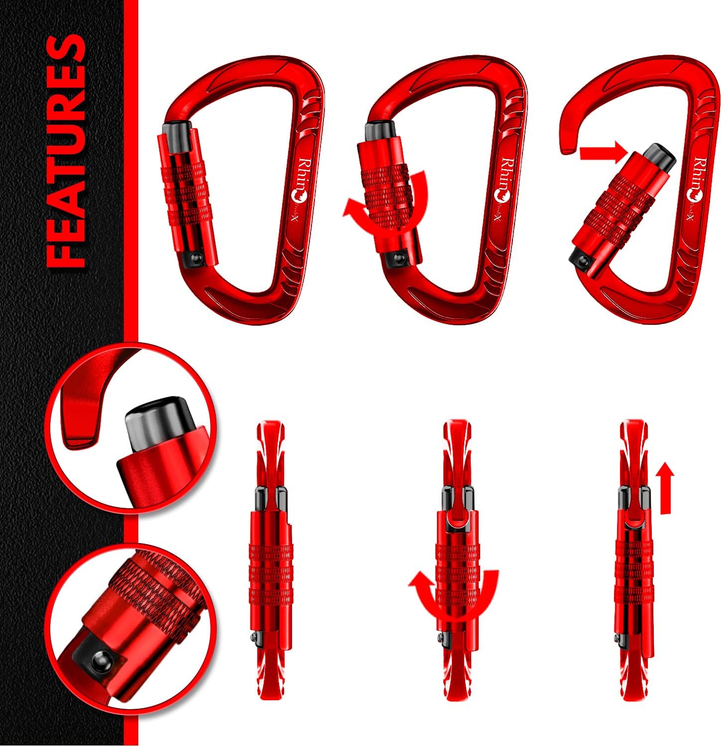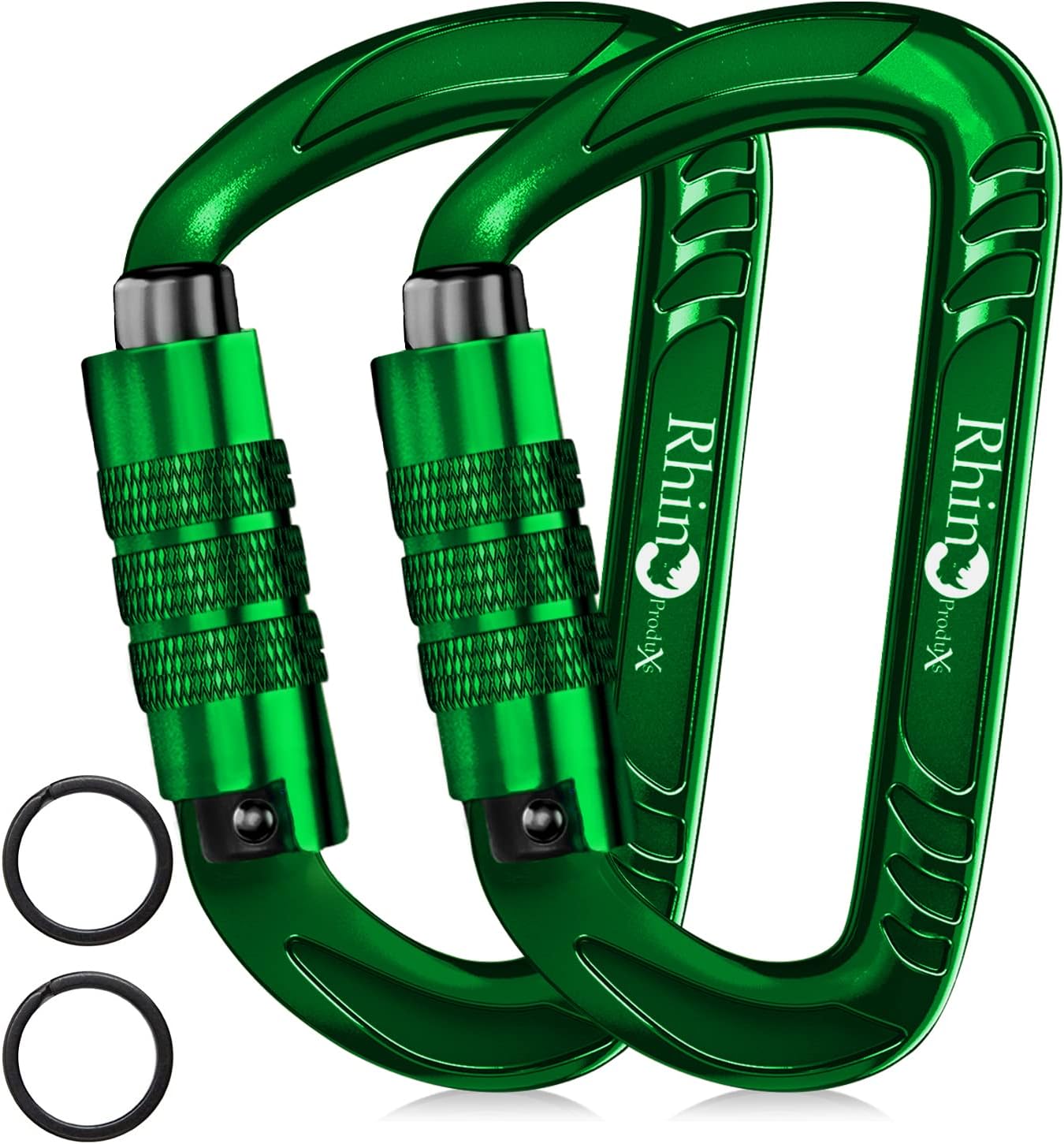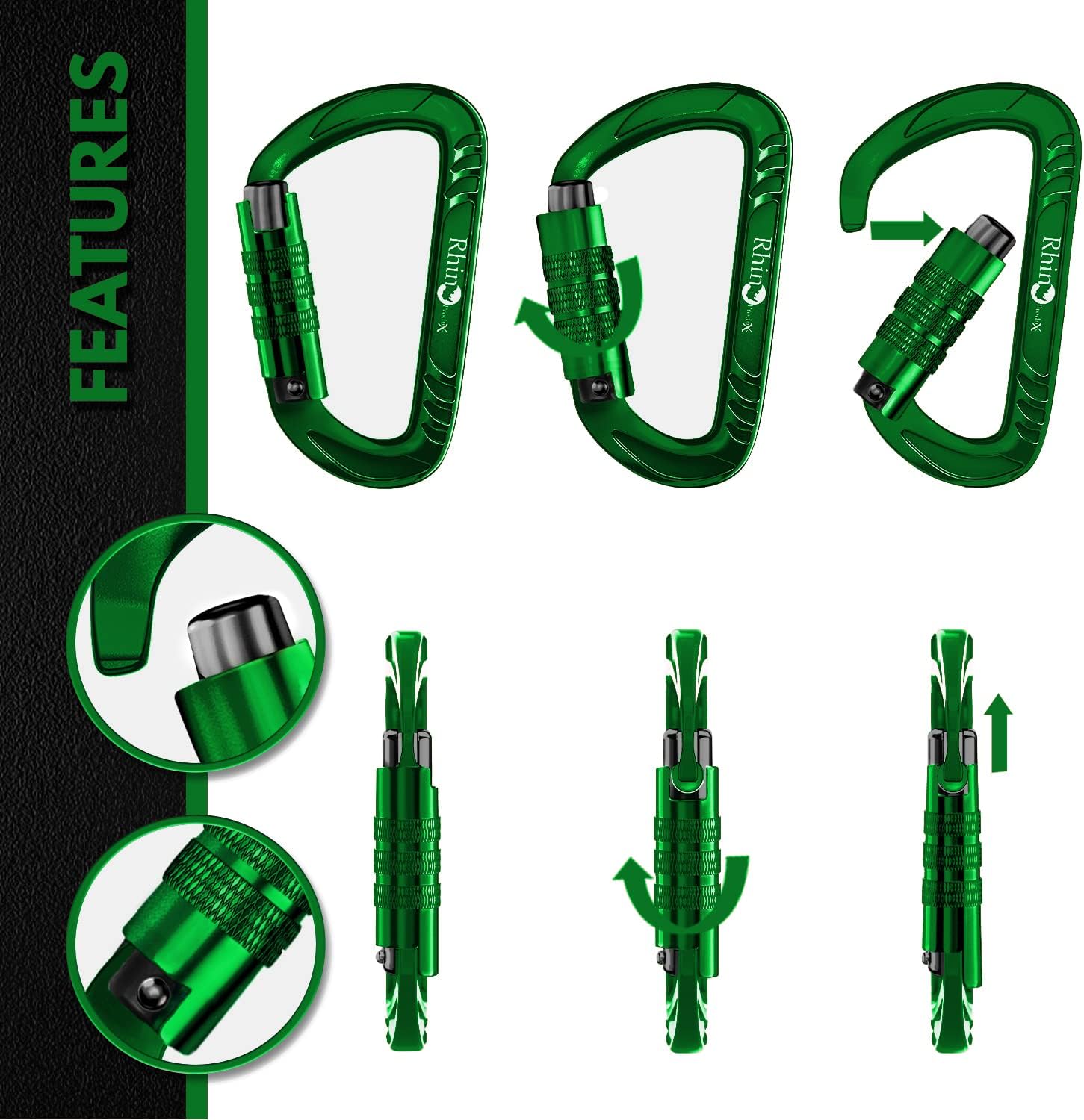 - 【Multi Purpose】 Rhino locking Carabineers are suitable for: hammock, camping, fishing, hiking, backpack, paddle, traveling, swing, punching bag, dog leash, attach sports bottles, yeti sling, keychain, travel tools, fix heavy object on a pickup truck, backpack clips for kids, keychain for women, bag hook, snap hooks, key clip for men, accessory & keychain carabiners, gear ties, toy grappling hook, cable machine accessories, key holder, d ring, boxing bag. Not For Climbing.