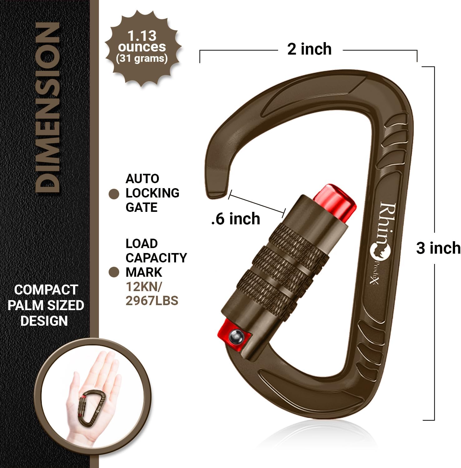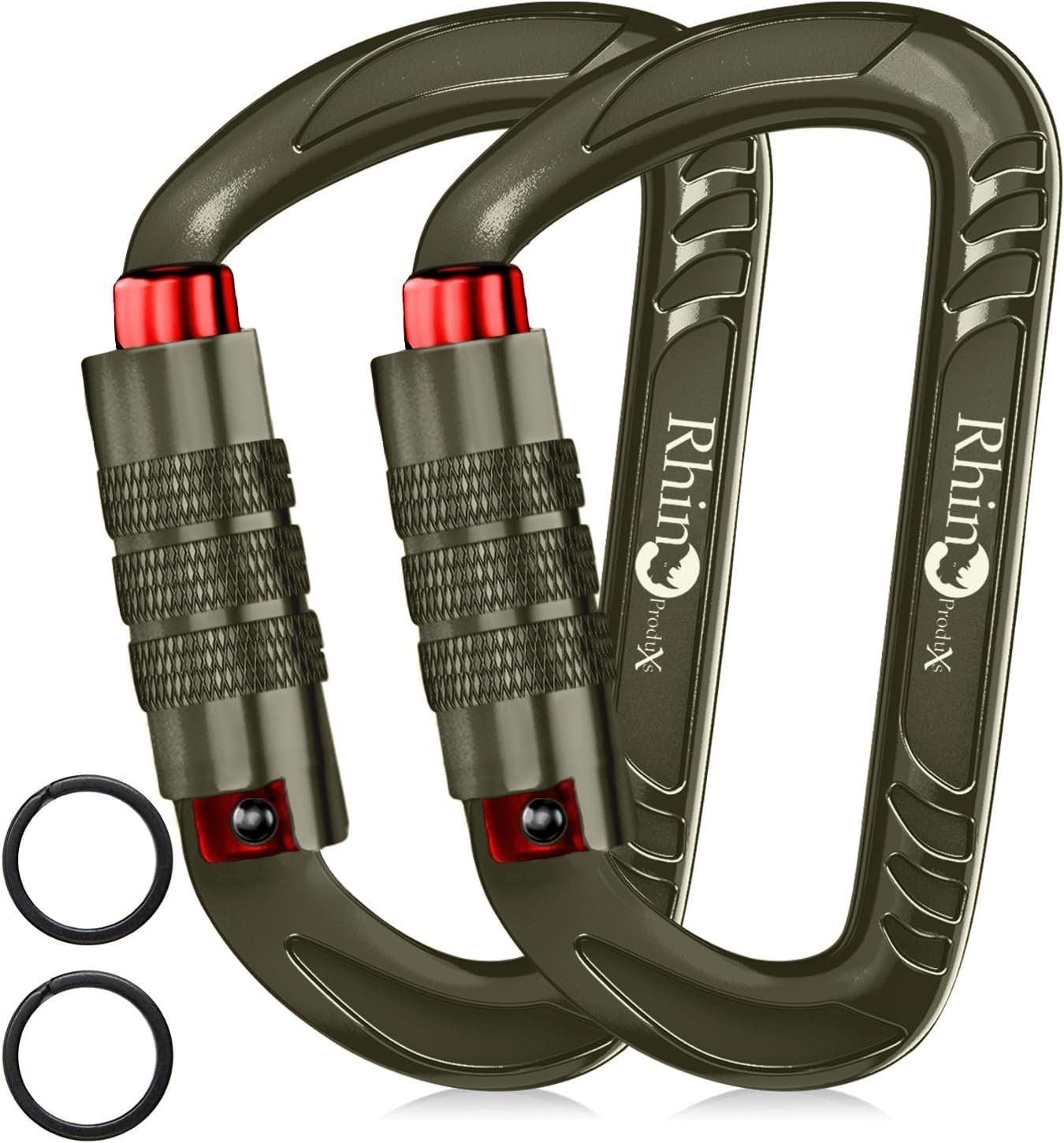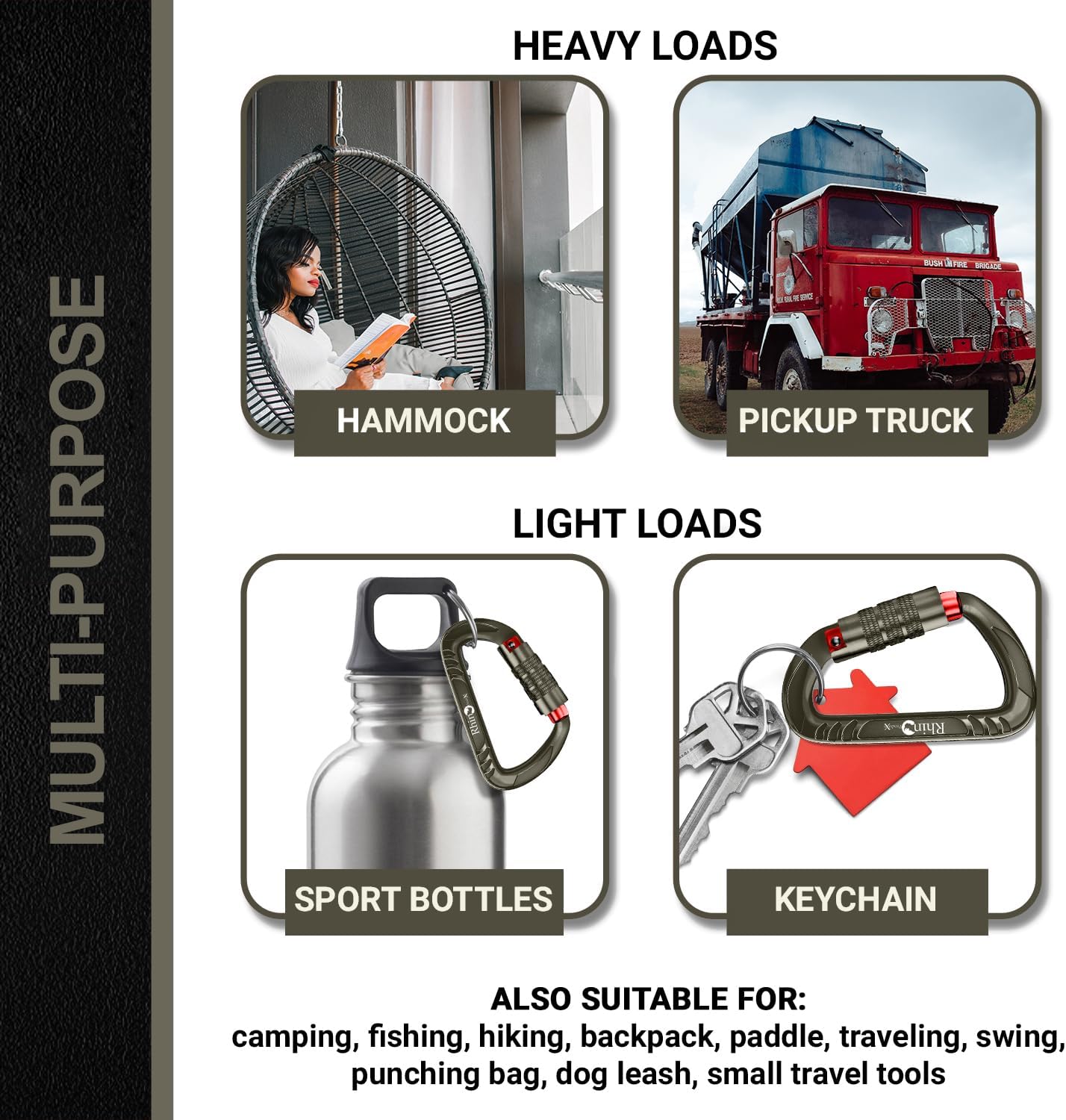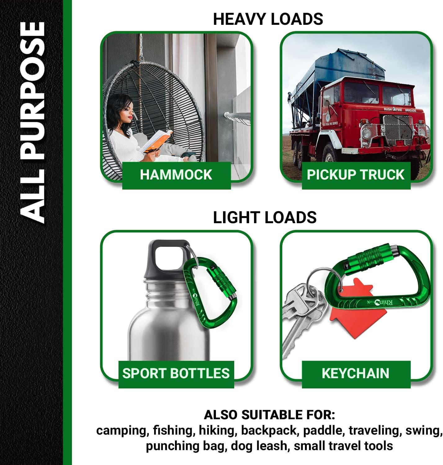- 【Multi Purpose】 Rhino locking Carabineers are suitable for: hammock, camping, fishing, hiking, backpack, paddle, traveling, swing, punching bag, dog leash, attach sports bottles, yeti sling, keychain, travel tools, fix heavy object on a pickup truck, backpack clips for kids, keychain for women, bag hook, snap hooks, key clip for men, accessory & keychain carabiners, gear ties, toy grappling hook, cable machine accessories, key holder, d ring, boxing bag. Not For Climbing.