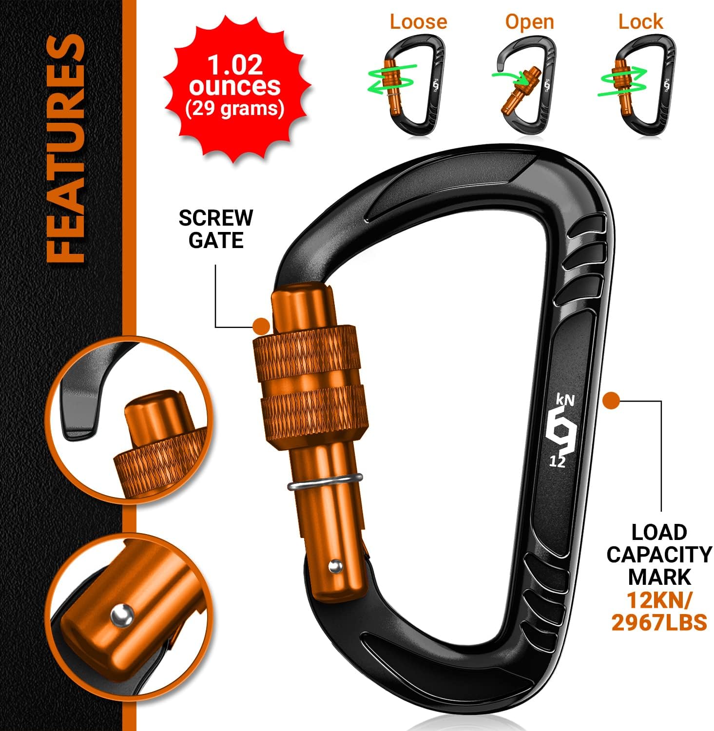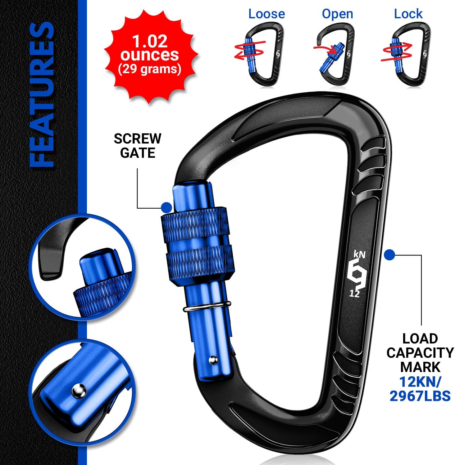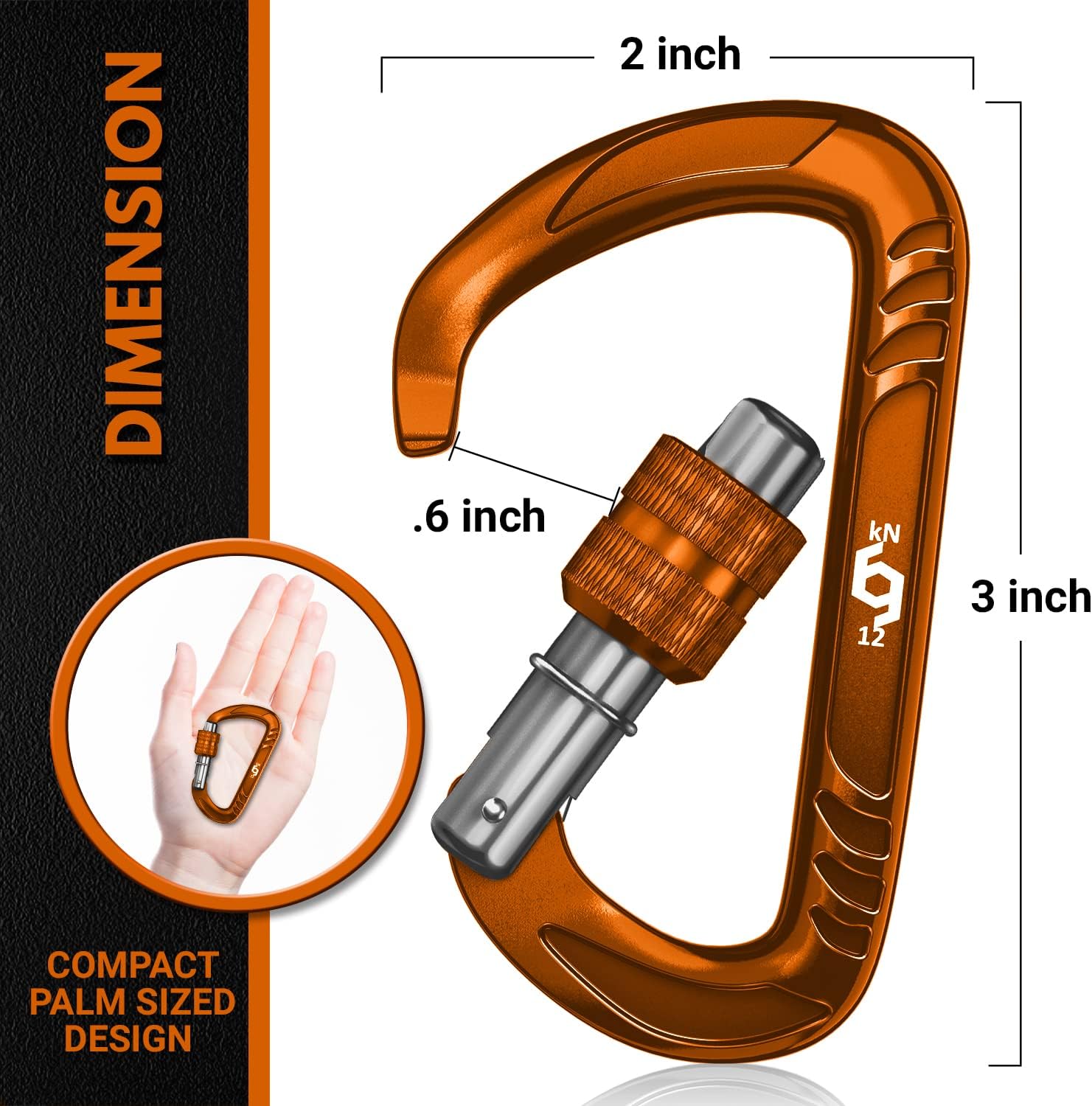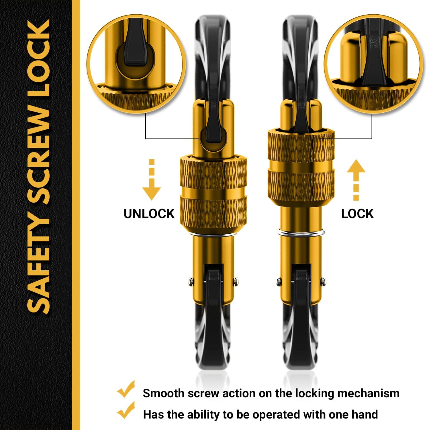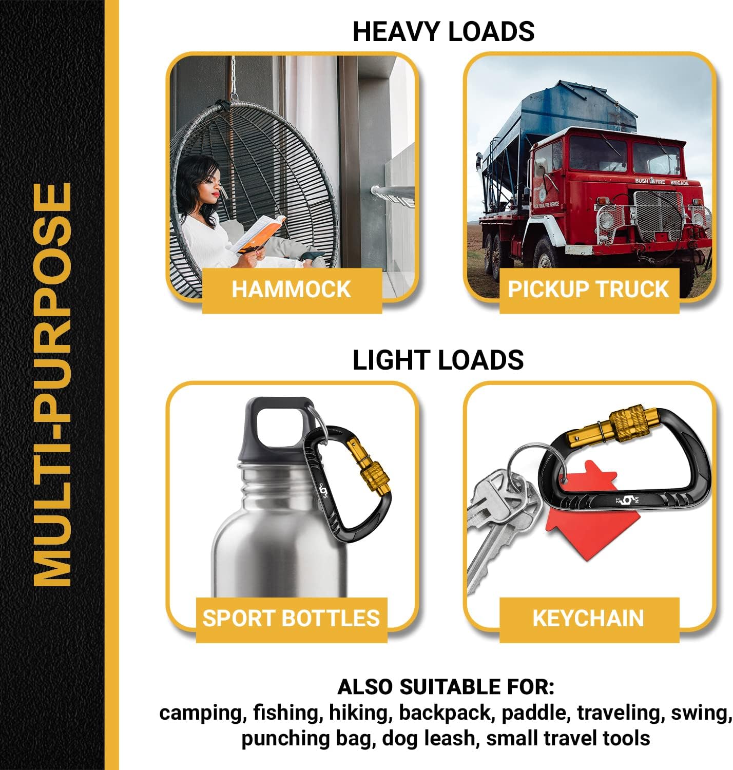 - 【Multi Purpose】 Rhino locking Carabineers are suitable for: hammock, camping, fishing, hiking, backpack, paddle, traveling, swing, punching bag, dog leash, attach sports bottles, yeti sling, keychain, travel tools, fix heavy object on a pickup truck, backpack clips for kids, keychain for women, bag hook, snap hooks, key clip for men, accessory & keychain carabiners, gear ties, toy grappling hook, cable machine accessories, key holder, d ring, boxing bag. Not For Climbing.