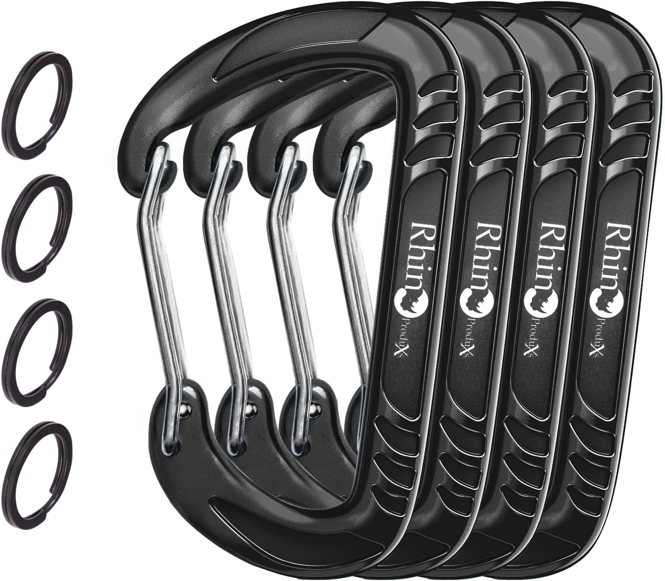 - 【Includes】 3.15 inch carabeeners hook clips with Keyrings. Elegant, various vibrant colors, strong and practical; with smooth edges. Rhino Carabiner Clips are crafted out of top-grade aerospace Aluminum 7075 while offering 12kN (2697 lbs.) of strength. This quick locking caribiner is one handed operation for easy setup/usage. This caribeaner clip D shaped design provides the strongest careebiner with a safe locking mechanism. 889 compliant.