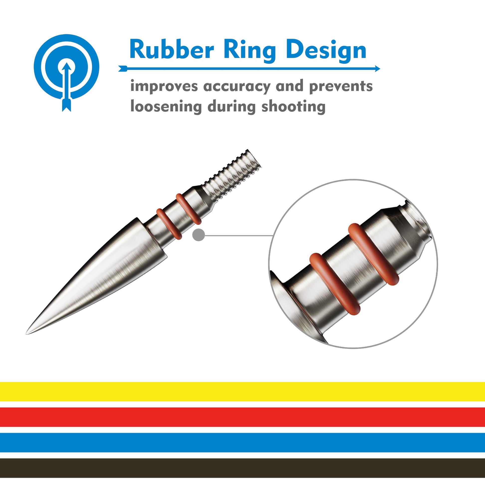 - [HIGH-QUALITY] Made from stainless steel, these arrow tips come with silicone rings without loosening. Remarkable durability and strength, ensuring optimal performance with every shot.