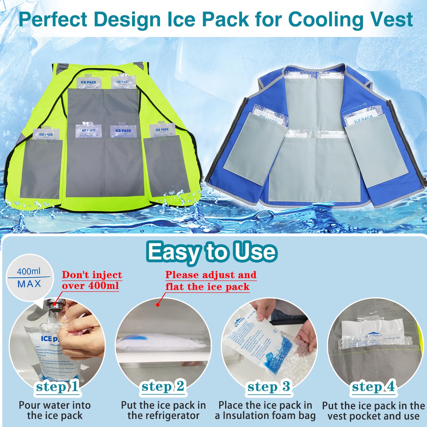- Pefect for Cooling Vest - Specifically designed for cooling vests, our gel ice packs fit the vast majority of cooling vests on the market, suitable for safety vest, and ice pack vest.
