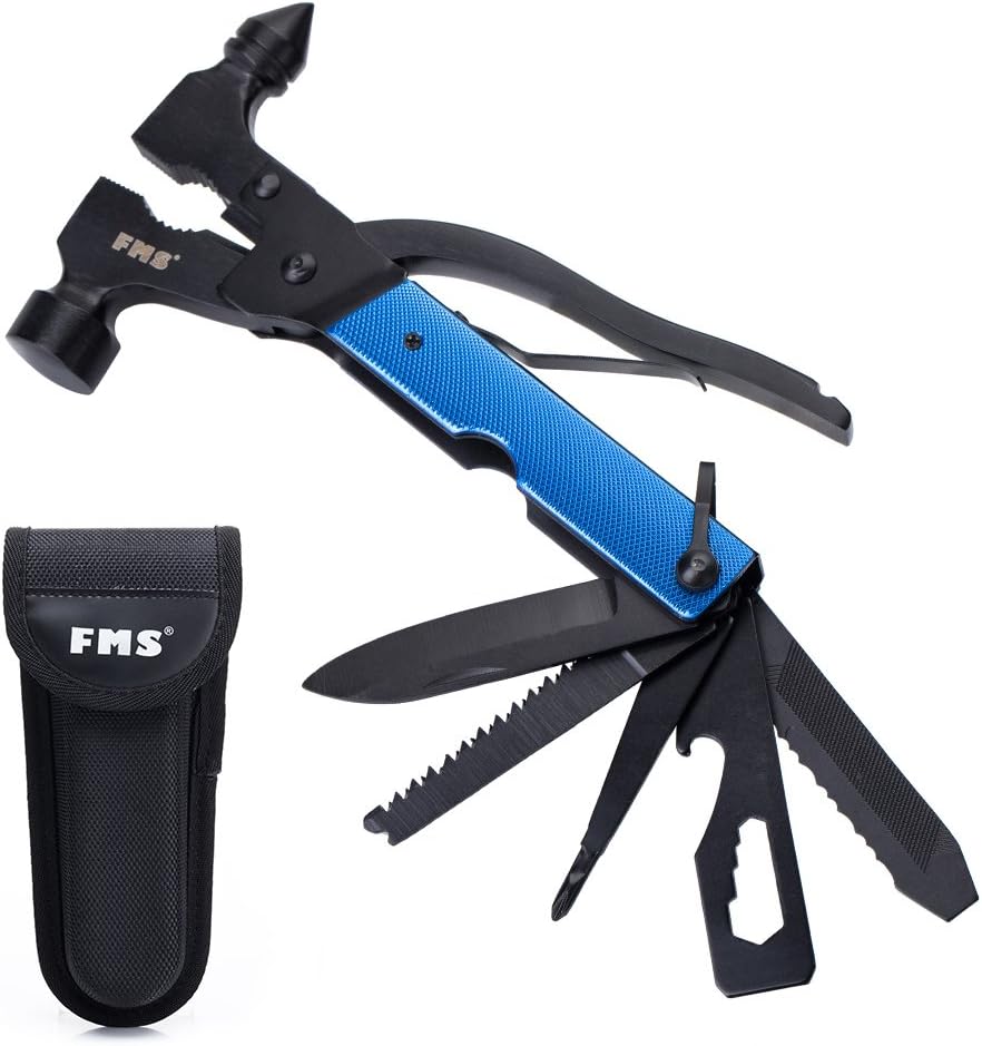 FMS Multi Tool includes hammer and pliers on one end, and a handle that contains folding knife blade, phillips screwdriver, saw blade, bottle opener/wrench combination blade, and file/saw blade combination.