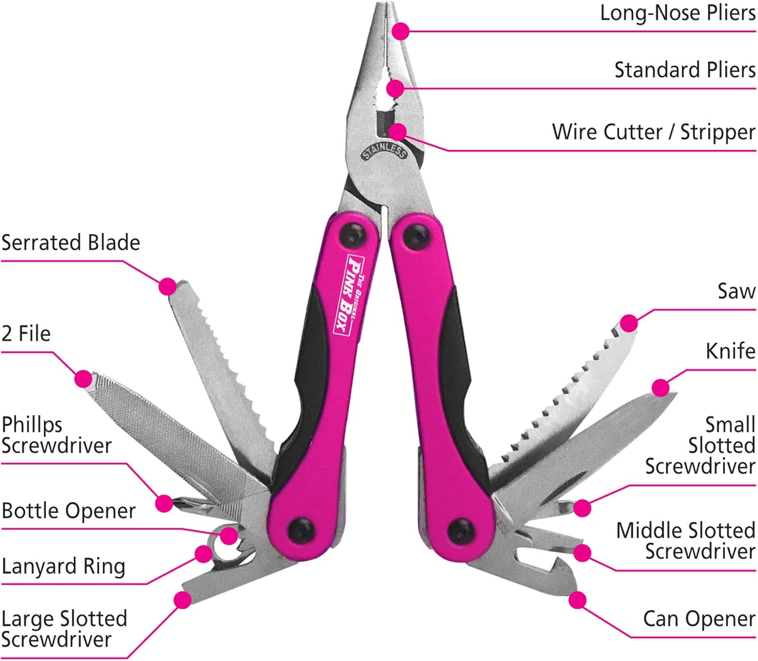 Add an extra touch of style and convenience to everyday tasks with the 14-in-1 Multi-Tool by The Original Pink Box®. Lightweight and compact, this multi-tool neatly packs 14 stainless steel tools into a durable aluminum body that can comfortably fit in your pocket for easy access when you need it. Plus, the smooth handle is designed for comfort during use. Includes long nose pliers, standard pliers, wire cutter/ stripper, serrated blade, saw, file, knife, philips screwdriver, small middle and large slotted screwdrivers, bottle opener, can opener, and lanyard ring. Backed by a limited lifetime warranty.