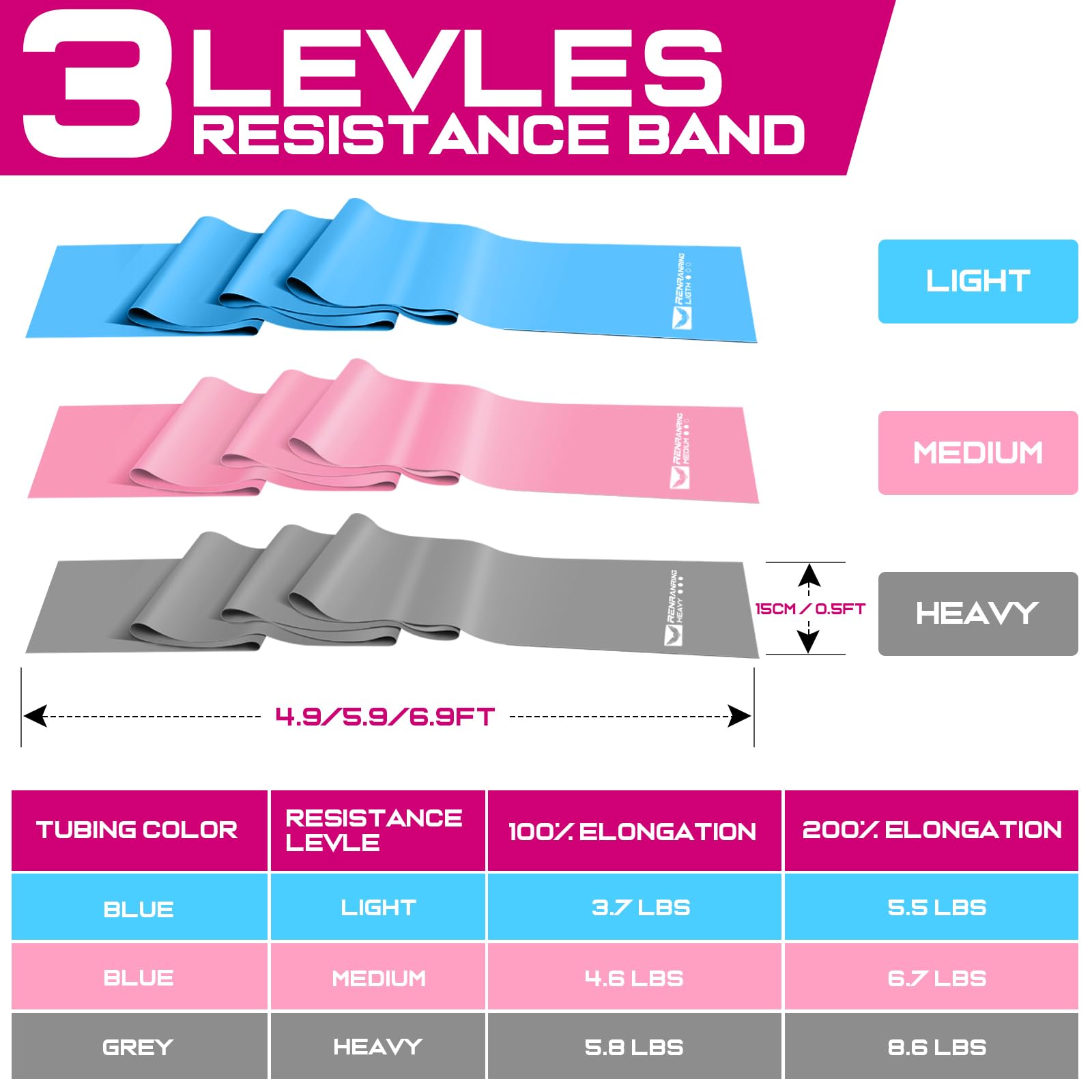 - Different Color Physical Therapy Levels: Come with 3 color, the different colors have an obviously different tension/strength. Blue 3.7~5.5 lbs, Pink 4.6~6.7 lbs, Grey 5.8~8.6 lbs. 4.9 ft long by 5.9 inches wide.