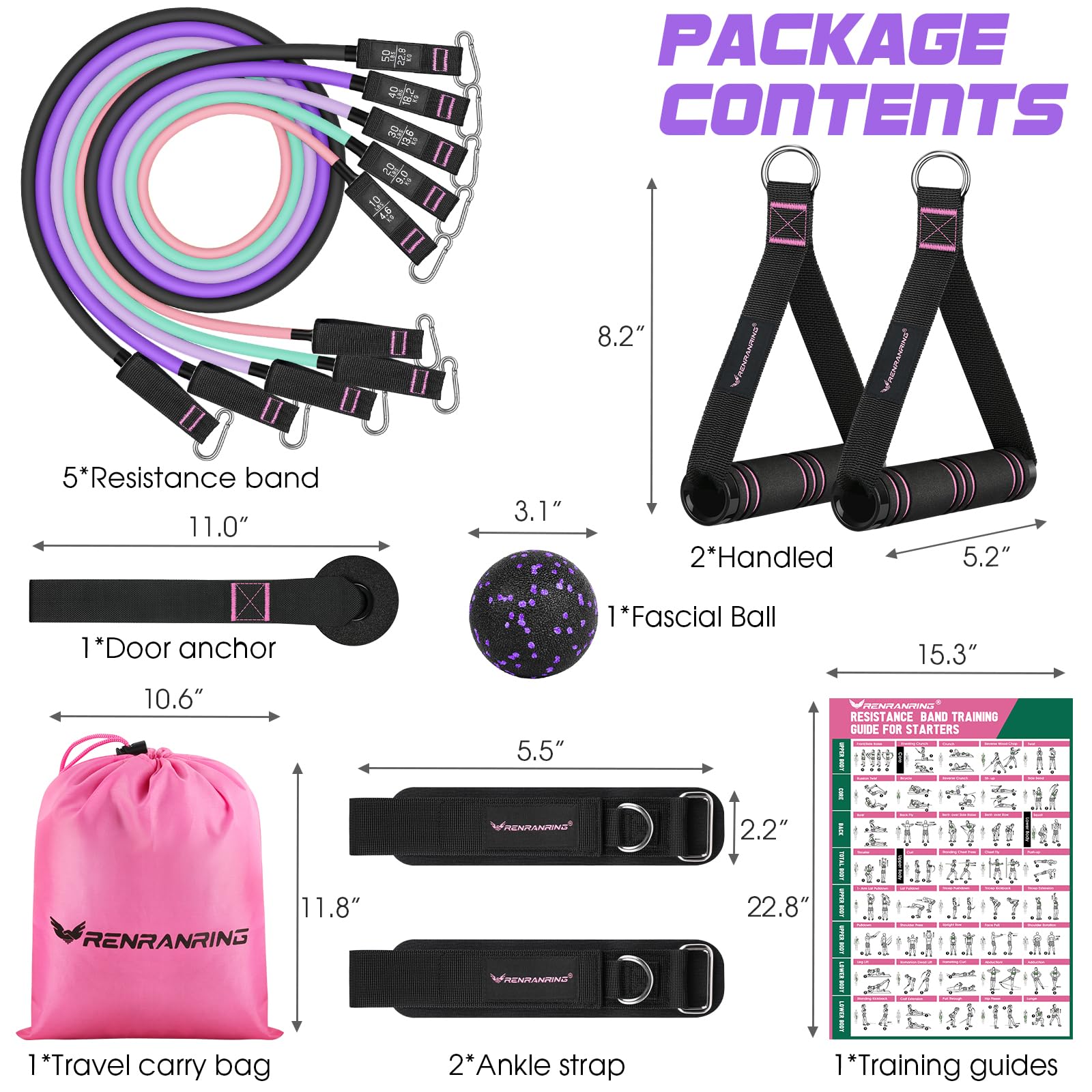 - Adjustable Resistance Tube Band Set: 5 resistance levels: Pink (10 lbs), green(20 lbs), Light-purple (30 lbs), purple (40 lbs), black (50 lbs). Stackable exercise bands, both in 51", maximum resistance is 150 lbs.