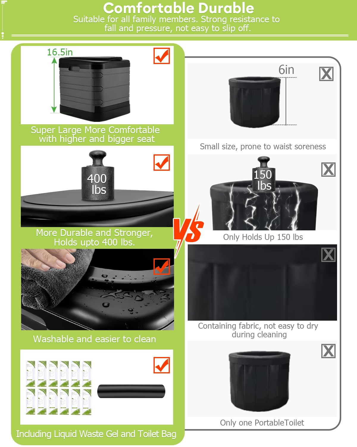 - 【Remarkable Load-bearing Capacity】Hutigertech Portable Toilet for Camping is made of premium ABS plastic, it is sturdy to bear up to 300lbs.It is suitable for adults, kids, male, female, women and all family use.Simple to use,easier to set up or fold down in seconds,Super easy and quick.