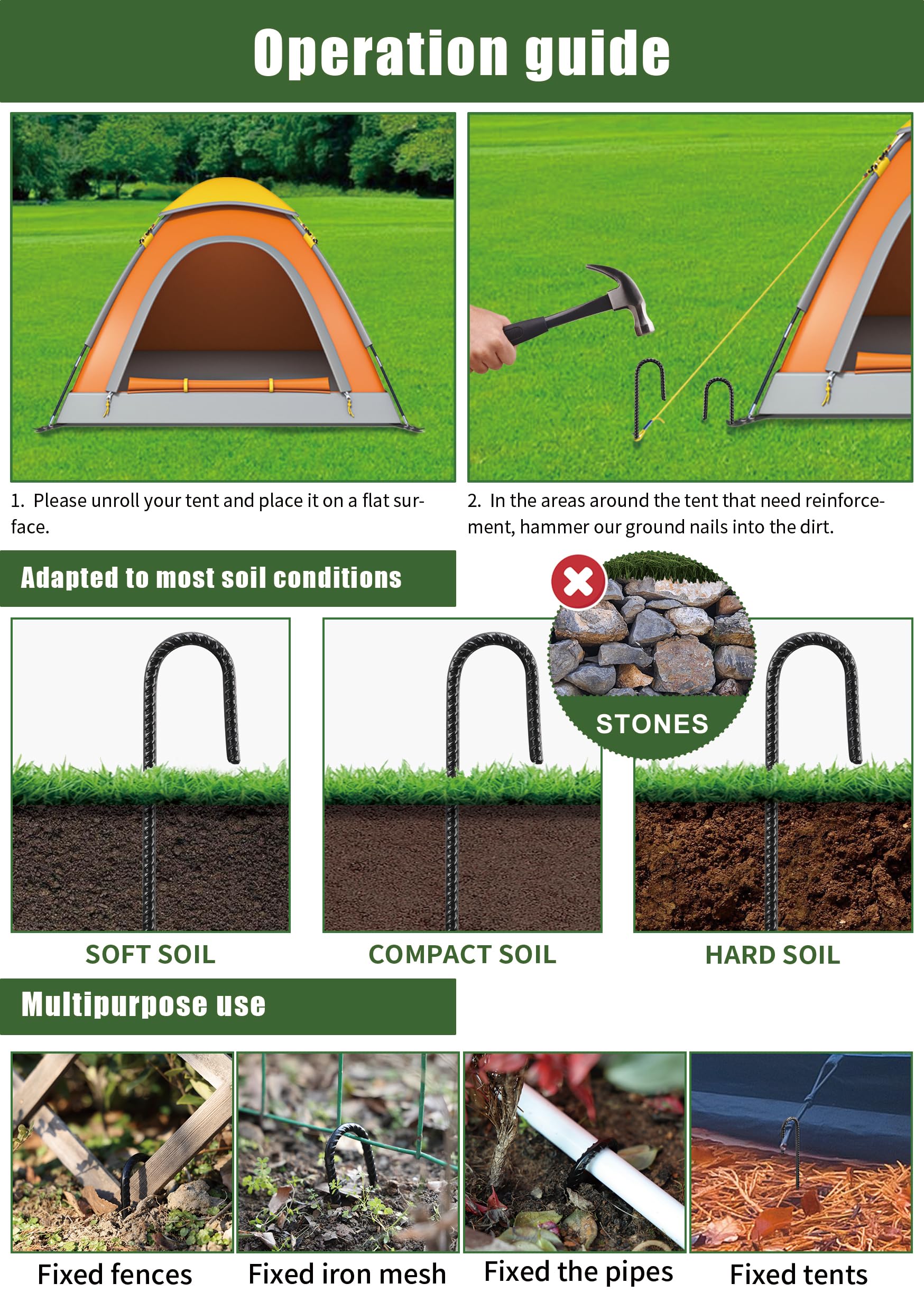 - Easy to Use: The tips of our heavy duty ground stakes are sharp and can go into the ground easily and stay in place. Because of J-shaped design, you can easily insert and remove it with hammer