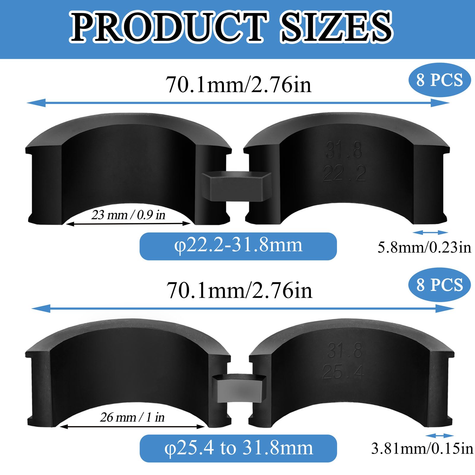 - Package Includes: 16 pcs handlebar spacers (8 pcs 22.2-31.8 mm + 8 pcs 25.4-31.8 mm). Two sizes of spacers to meet your needs for mounting on different sized handlebars, enough quantity for your daily use and replacement.