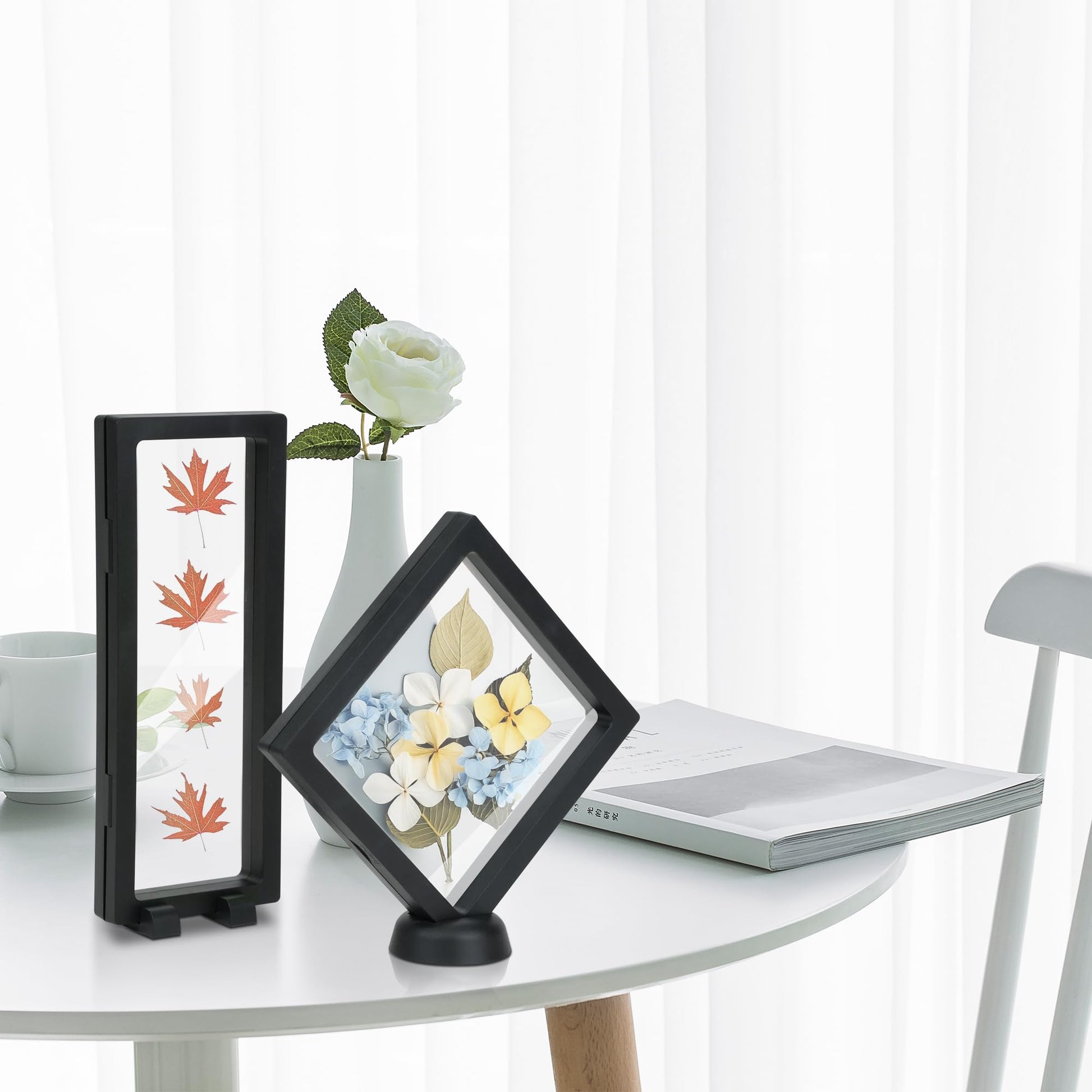 - 【16 PCS Black Film Suspension Case】This is a combination set containing 8 square tabletop floating frames with dimensions of 5.51*5.51*0.78(in) and 8 rectangular black display stands with dimensions of 3.54*9.05*0.78(in), as well as 8 round bases and 8 pairs of bowed bases, which are made of a plastic casing and a high-toughness PE film that effectively prevents the product from accumulating dust and oxidizing and producing scratches.