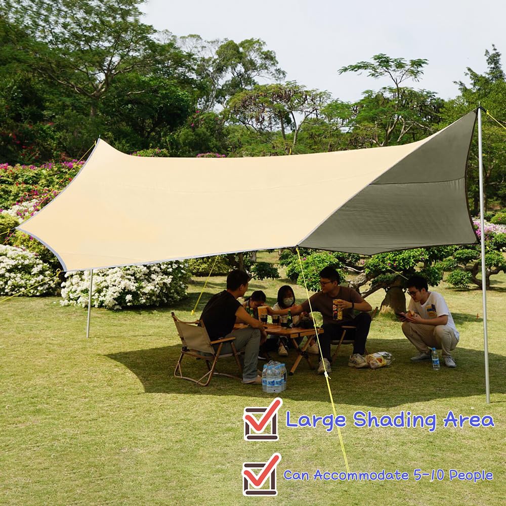 16x16 ft Large Camping Tarp Waterproof Hammock Rain Fly Camping Awning Sun Shelter Khaki (Without Pole) (Khaki)