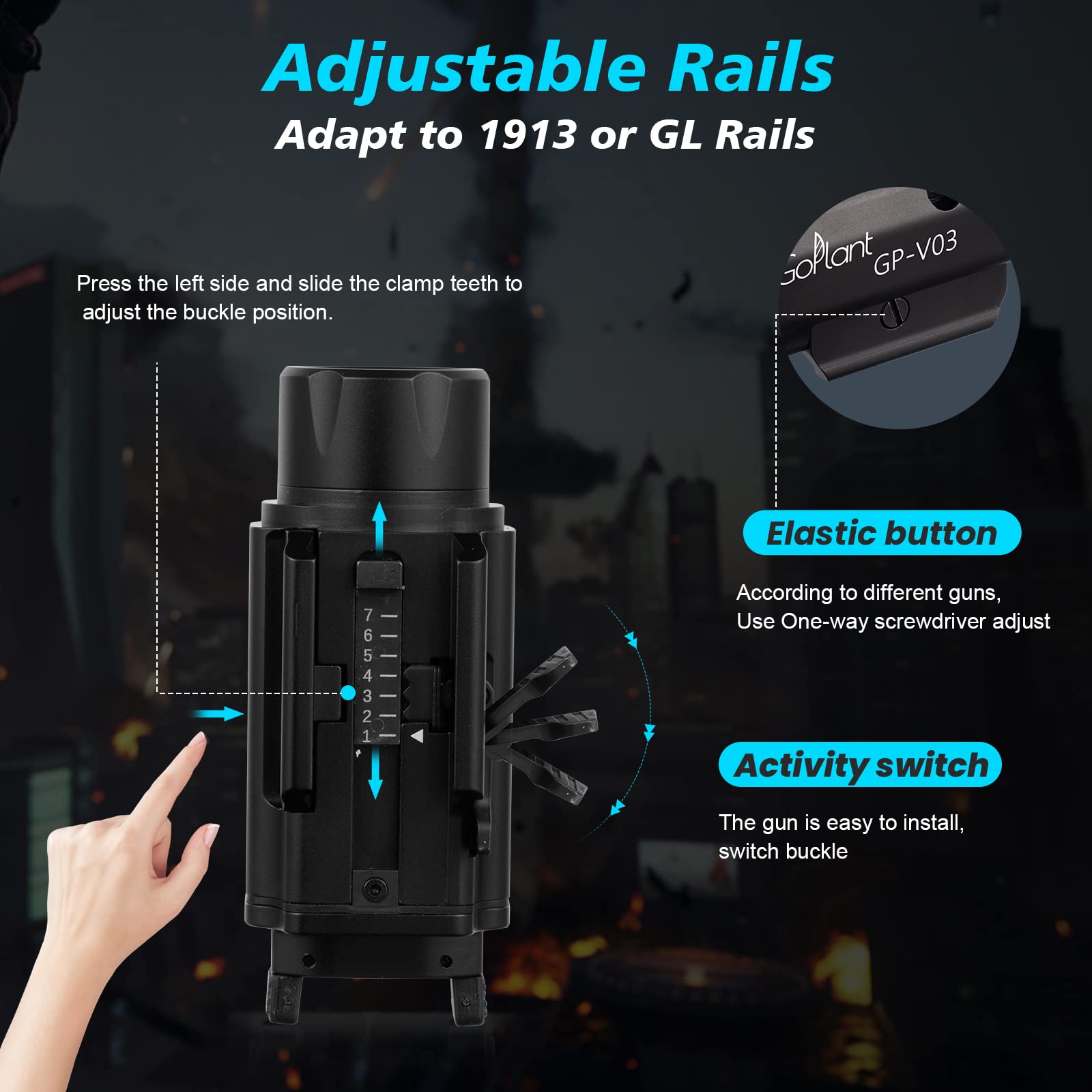 - 【HIGH EFFICIENCY LASER CALIBRATION】: LED tactical light is equipped with manual screw tightening to adapt to GL and Picatinny guide rails, and it is also equipped with an Allen wrench, which can easily adjust the laser offset or zero up, down, back and forth on the gun light to adapt to different combat styles, so that it is more compatible with different environments.