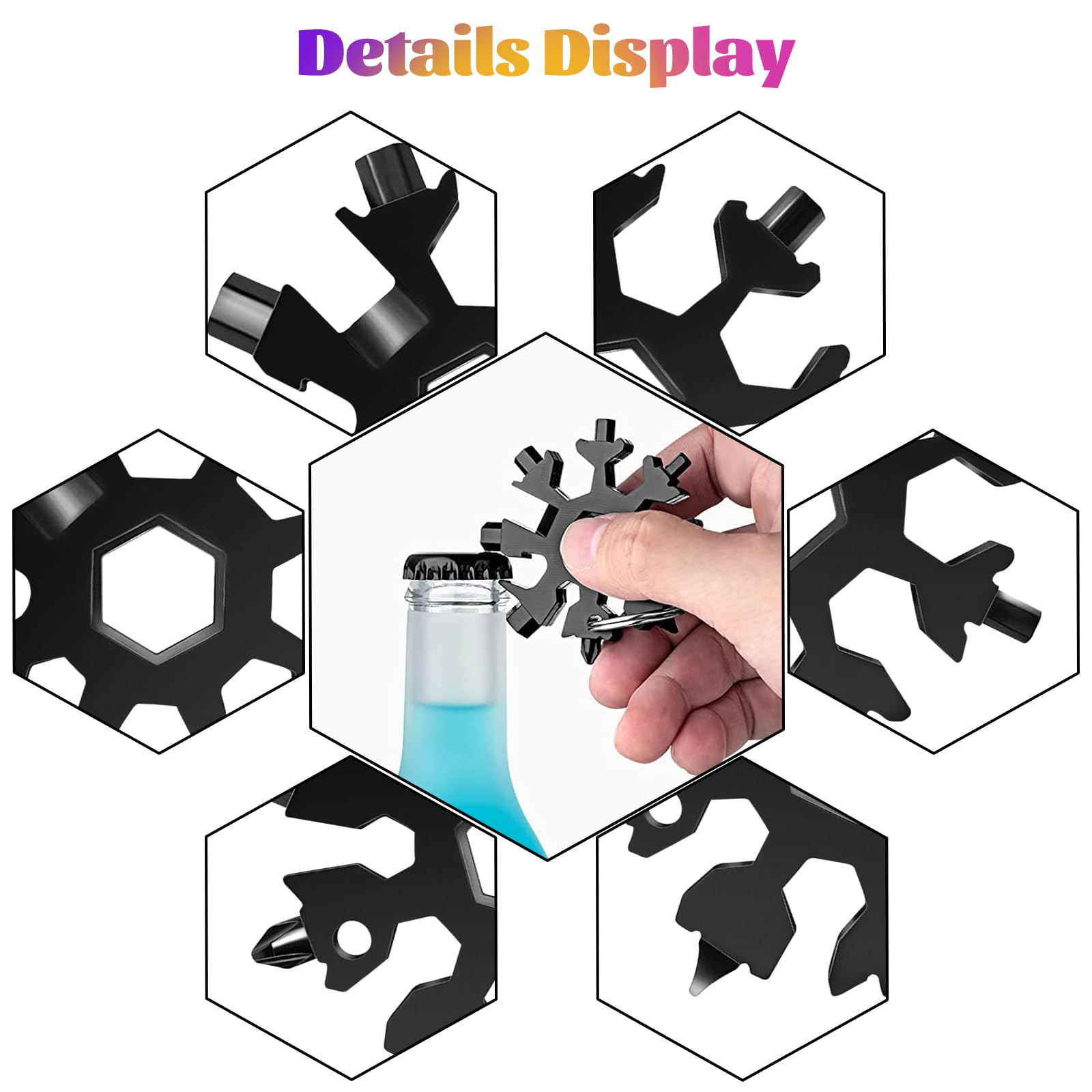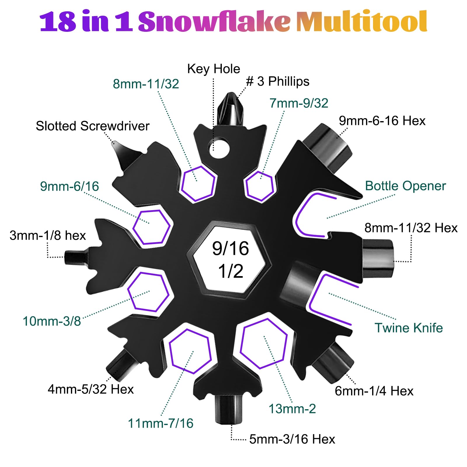 - 【Multiple Use】This 18-in-1 snowflake tool can be used to open beer bottles, open cartons, turn the screw, secure snowboards, bikes, toys and more. It can also be used for outdoor activities, such as traveling, camping, boarding, fishing, rescue and other things that can be used.