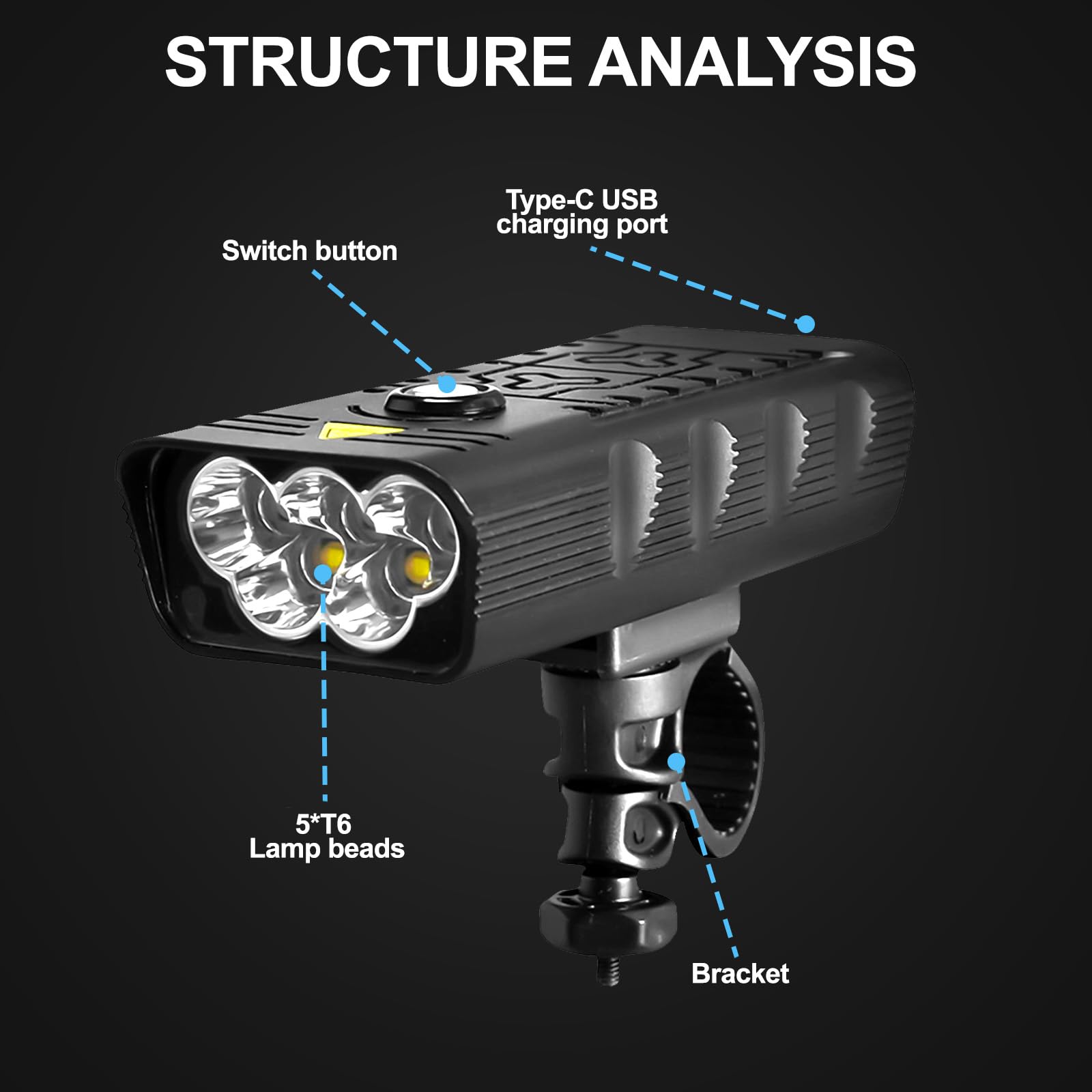- [High Brightness &Long Range] The bike lights are designed for safe night riding, featuring 5* T6 LED beads that boost the lighting range by 50%.Super bright bike light has a maximum output of 1800 lumen, reaching distances of up to 2624feet with a wider angle view, illuminating the road as you ride at night.