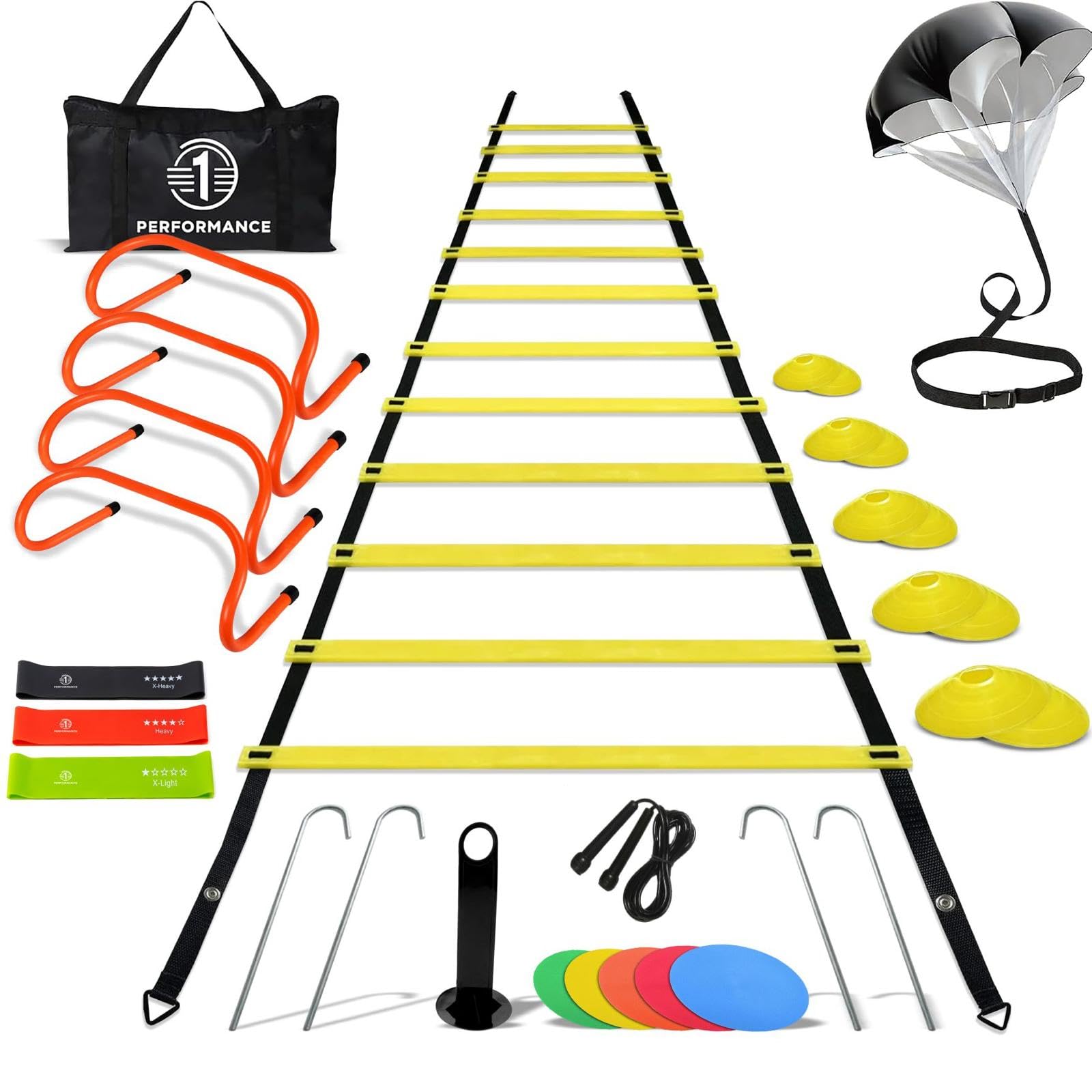 - VERSATILE TRAINING - Enhance agility and speed with this comprehensive set. Includes running parachute, agility hurdles, speed ladder, resistance bands, and soccer cones for diverse workout routines