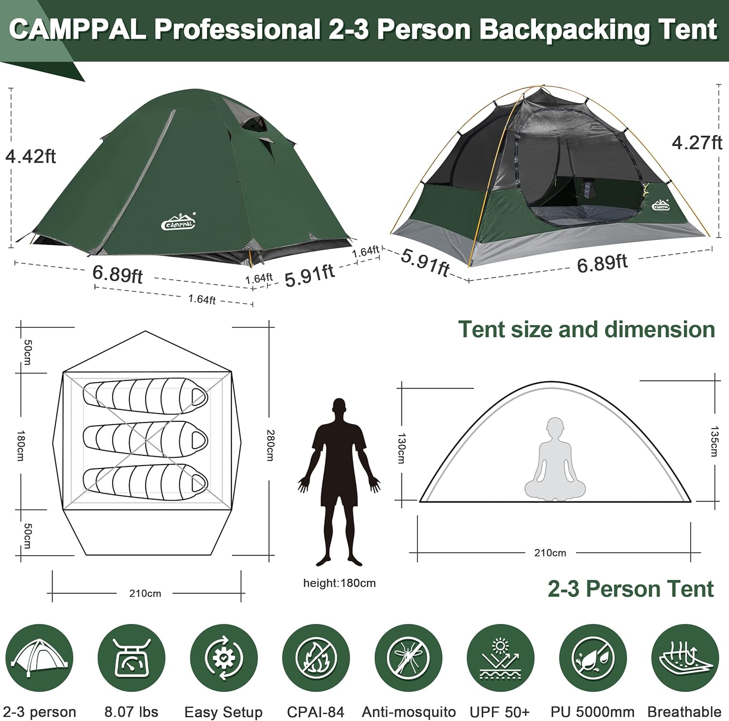 - Spacious Interior & Ventilated:With an inner size of 6.89ft X 5.91ft X 4.27ft, rainfly size of 6.89ft X (1.64ft + 5.91ft + 1.64ft) X 4.42ft, Camppal backpacking tent is spacious enough to accommodate up to 2-3 person. The mesh fabric used in the 4 season tent not only protects against mosquitoes but also promotes air circulation. The double-door structure and 3 ventilation windows ensure a moisture-free and comfortable night's sleep.