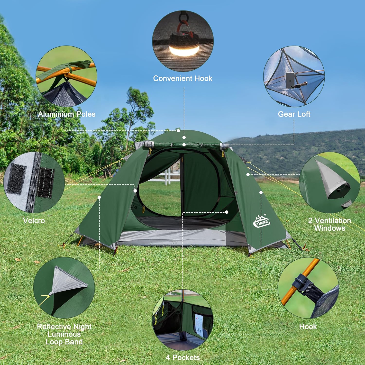 - Easy Setup:Setting up our camping tent is a breeze, thanks to its design with only 2 crossing aluminum poles. Even when you're alone, you can easily set it up in just a few minutes. Freestanding allows the 2 person tent to be moved and relocated without having to disassemble. Additionally, the gear loft and 5 storage pockets perfect for holding pouches with your sleep gear, glasses, and other essentials. The outer layer vestibules provide extra space to keep your luggage dry and protected.