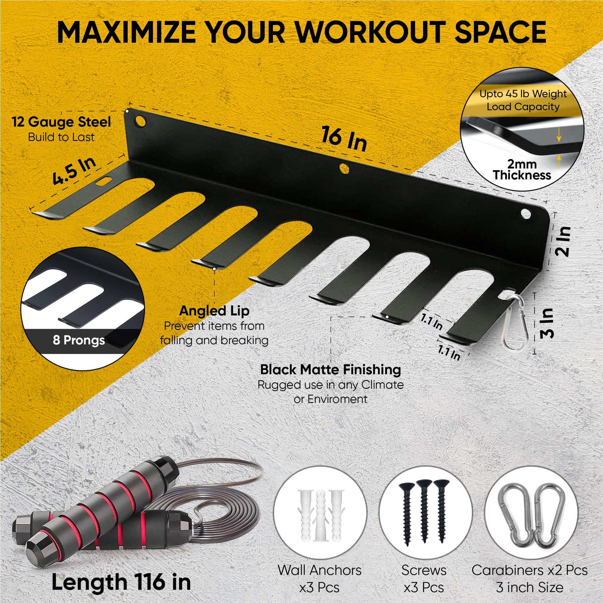 - 🦾Heavy-Duty dumbbell wall rack + including jump rope. This wall mount dumbbell hanger rack, garage band equipment, jump rope hangers was manufactured from steel resistant to most environments. Perform high quality workouts, keeping your environment organized with this fit fitness band rack and other training equipment.