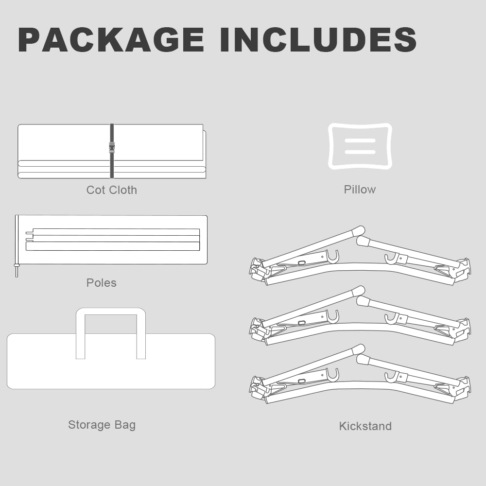 - 【Portable Camping Cot】 Set-up dimensions: L COT: 190*68.5 cm/ 75*27 inches, Weight: 3.8kg/ 8.4 lb; XXL COT: 210*78 cm / 83*31 inches,Weight: 4.3kg/ 9.5 lb. Folded dimensions: L COT: 58*16*16 cm / 23 x 6.3 x 6.3 inches; XXL COT: 73*22*18 cm / 28.7*8.6*7 inches. The package includes: 1 cot and 1 pillow. The portable cots for adults comes with a carrying bag, making it widely suitable for camping, hiking, fishing, mountaineering, office use, yard use, and even hospitals. No matter where you are, this travel cot will ensure you get a good night's sleep.