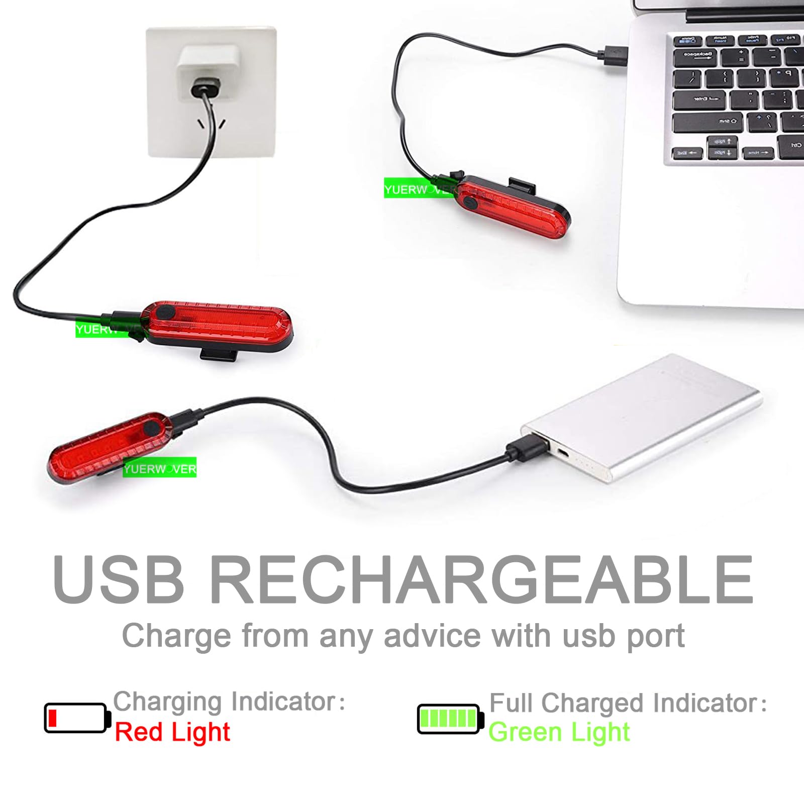 - USB RECHARGEABLE DESIGN: The Tail Light comes with a USB Charging Cable, can charge from your computer, power bank or any device with a USB port. After fully charging for about 2 to 3 hours, the light can run for 4 to 12 hours.