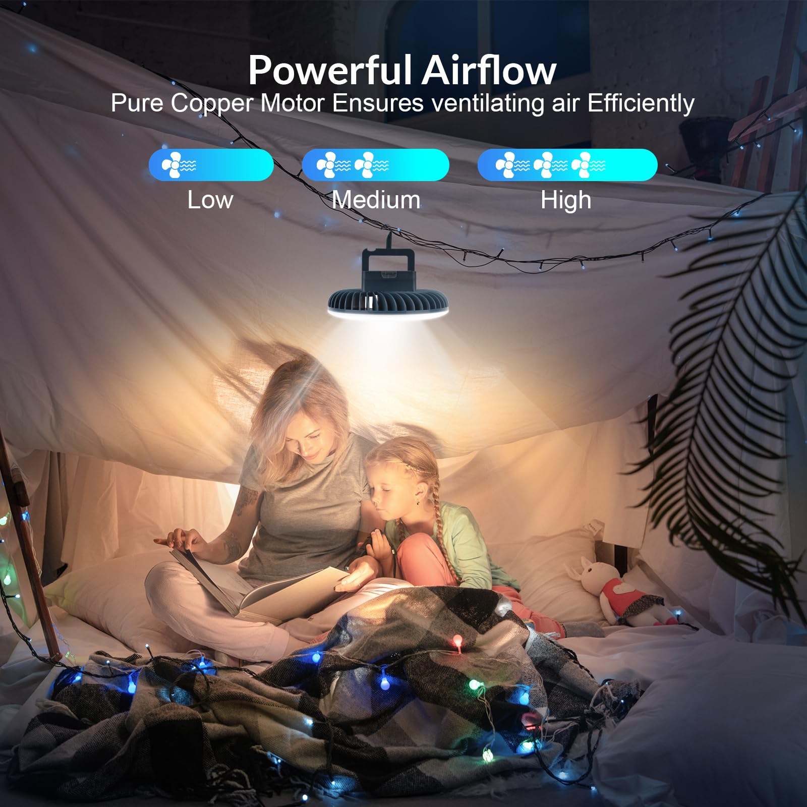 - 【Powerful but Quite Airflow】Pure copper motor ensures ventilating air efficiently, 3 speeds to choose from, High setting to cool down fast, Mid setting to circulating the air around, Low setting is comfortable and quiet. Adopts upgraded noise reduction technology, provide powerful airflow at the lowest noise, quiet and effective. A must-have camping supplies.