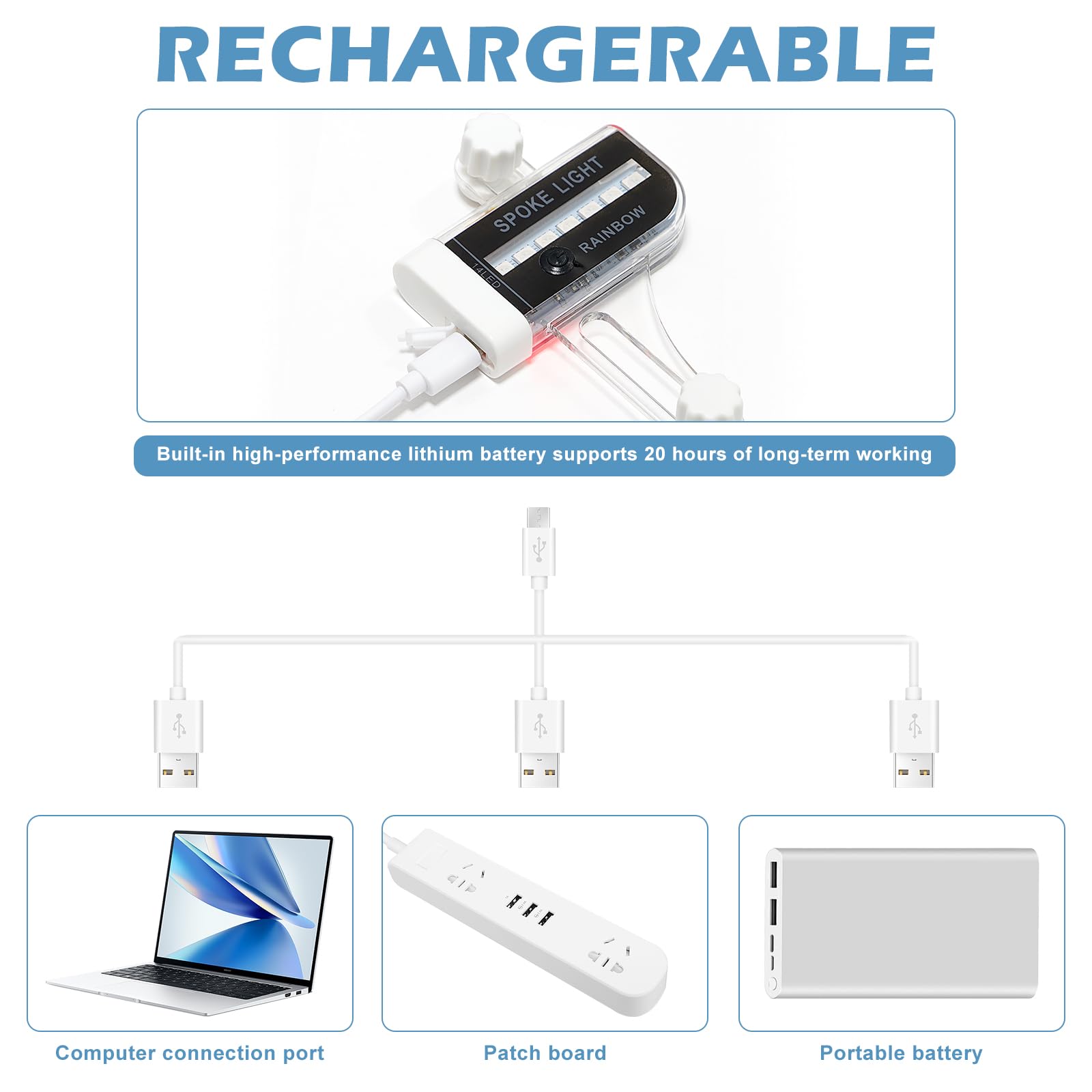 - [RECHAREABLE BATTERY & REUSEABLE] Our bike wheel light features a built-in rechargeable 220mAh lithium battery, providing over 22 hours of continuous use. It is suitable for 16 inches and larger spoke wheels, making it versatile and reusable.