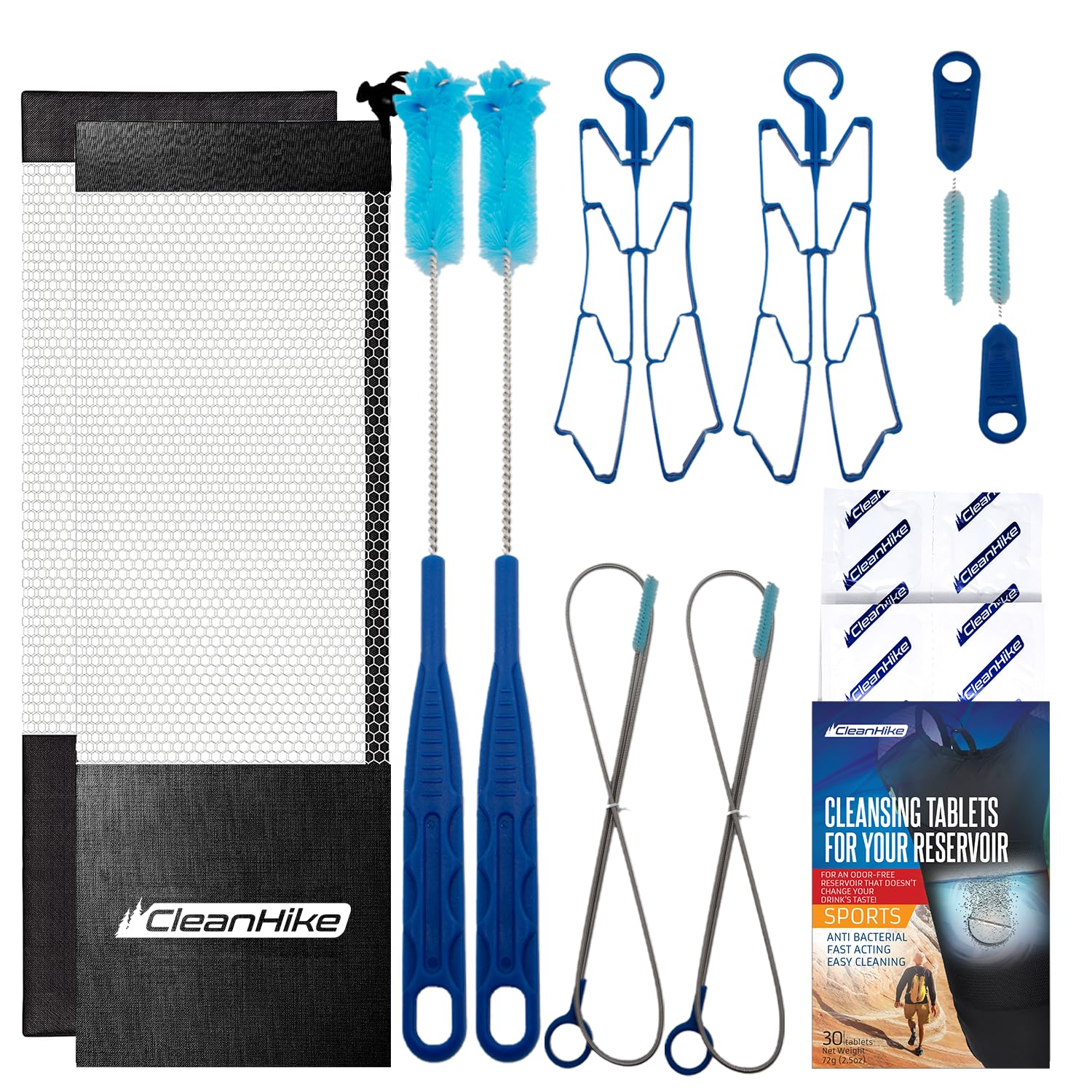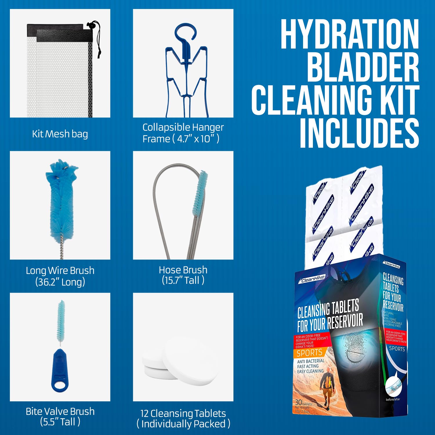 - GET A COMPLETE CLEANING KIT FOR YOUR HYDRATION PACK BLADDER including 1 long, 1 small and 1 flexible cleaning brush, 1 collapsible frame for drying, 12 cleansing tabs and 1 carrying pouch in a great value set.