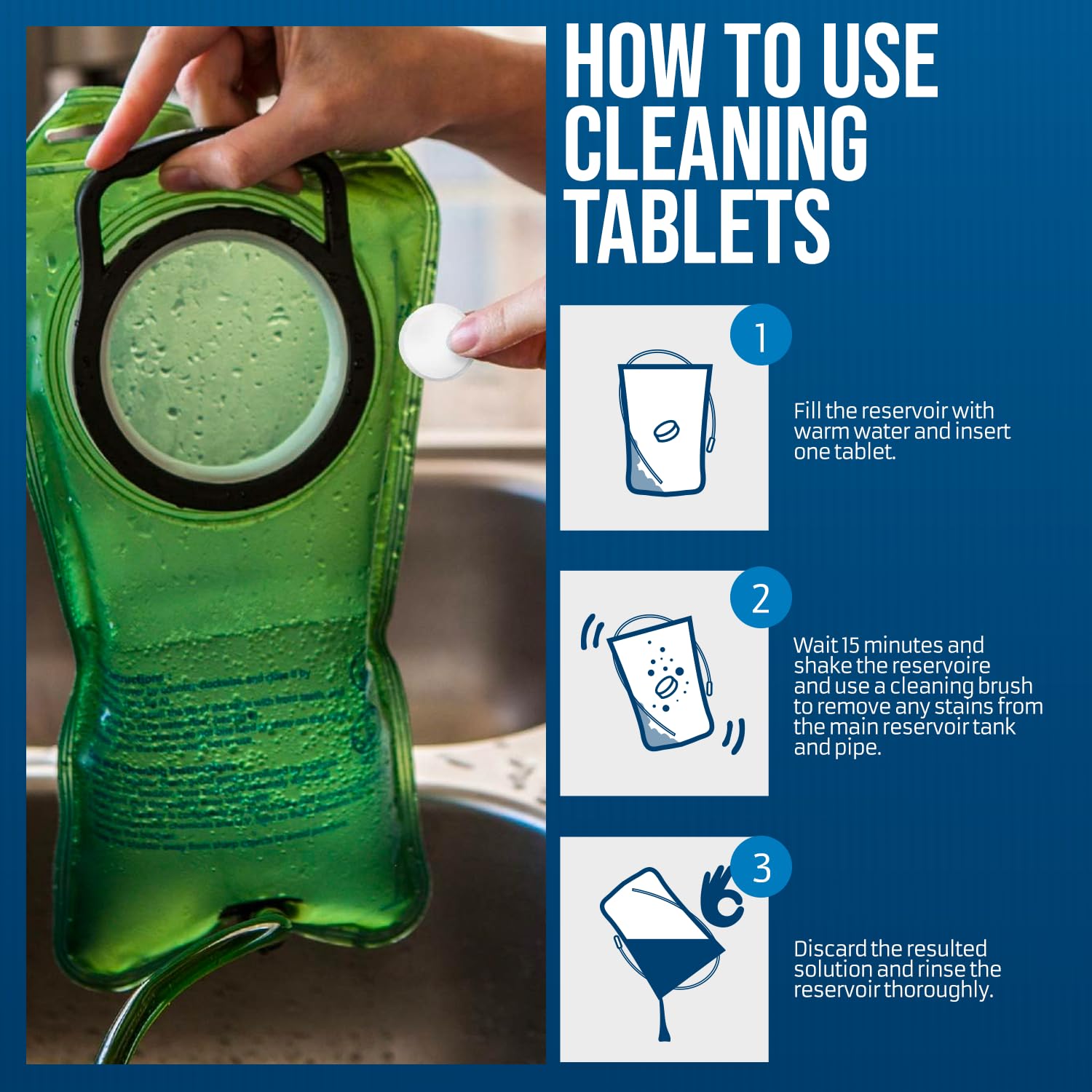 - KEEP YOUR 2L OR 3L HYDRATION BLADDER CLEAN: Reach easily remote areas of your backpack bladder, clean the mouthpiece and let it air dry. The cleansing tablets ensure your gear remains perfectly clean.