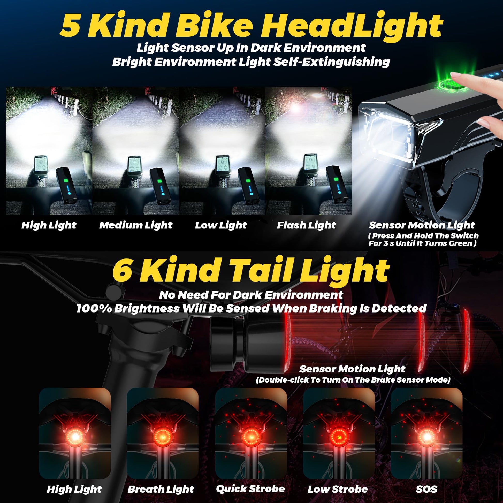 - 【11 Kinds Set Modes】5 Kind bike HeadLight: High Light, Medium Light, Low Light, Flash Light, Sensor Motion Light (Press and hold the switch for 3 s until it turns green, the sensor induction mode is on); If the surrounding environment is bright the lights self-extinguishing; If the surrounding environment is dark, the lights induction lights on; 6 Kind Tail Light: High Light, Breath Light, Quick Strobe, Low Strobe, SOS, Double-click to turn on the brake sensor mode