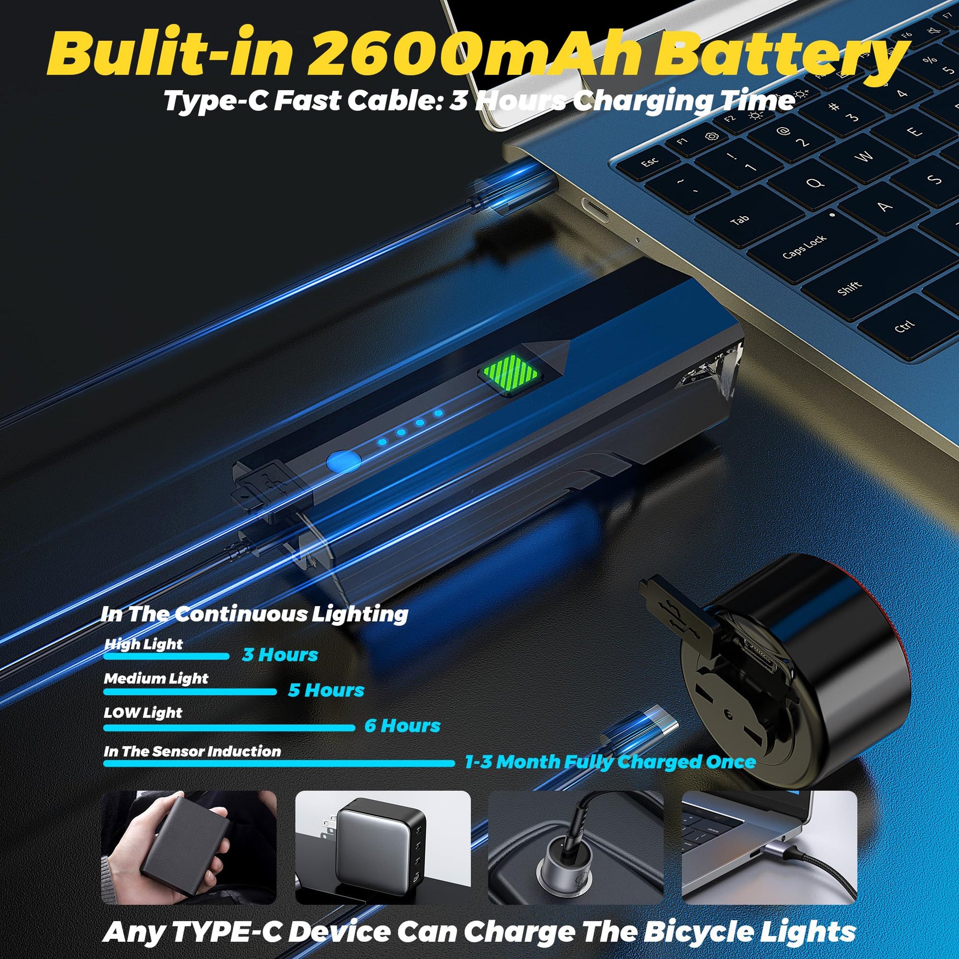 - 【Fast Charger & Long Lasting Time】This bicycle lights front and rear uses a Type-C fast charging data cable, and it only takes 3 hours to fully charge; This bicycle lights front and rear rechargeable has a built-in 2600mAh; In the continuous lighting, the high brightness can be used for 2.5-3 hours, the medium brightness for 5 hours, and the low brightness for 6 hours; In the sensor induction, the bicycle light set can be used for 1-3 Month fully charged once