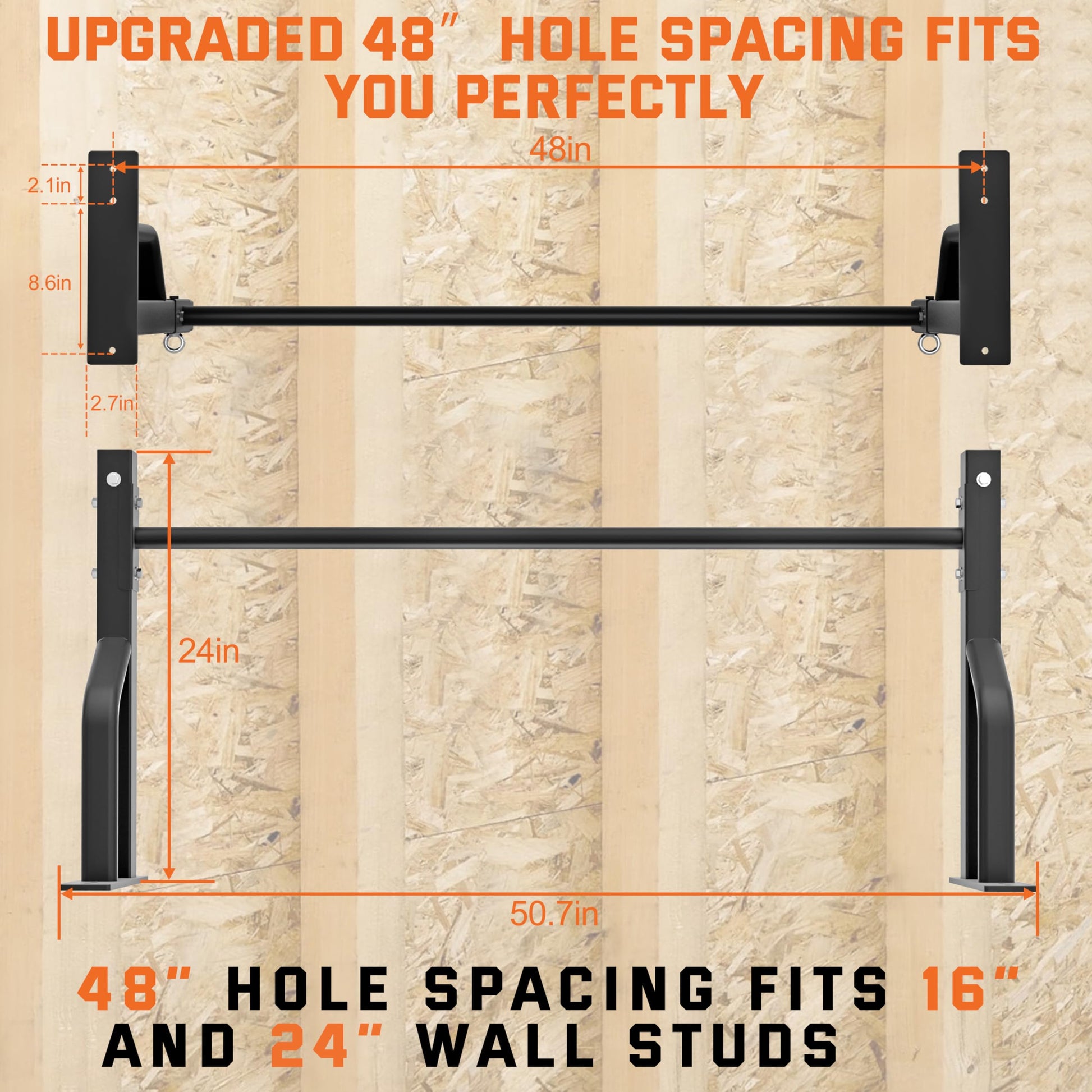 - 【Easy Installation & Space-Saving】 — The joist pull up bar is 48" wide and mounts directly to your wall stud at 48 inches (fitting both 16" and 24" studs) ,It can be easily fitted on walls or ceilings and is compatible with wooden and concrete surfaces. Now, you can have your upper body workout without sacrificing floor space.