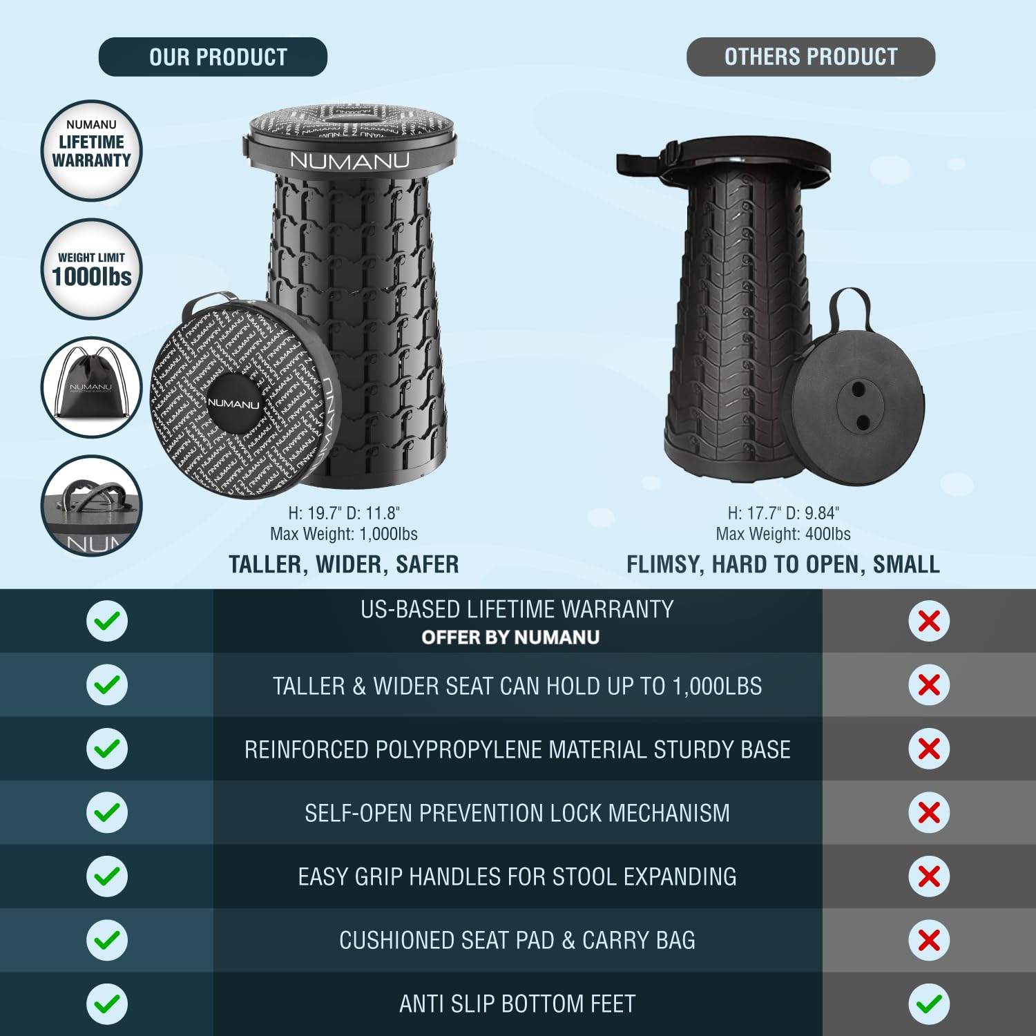 - 🆕【2025 UPGRADED, US-PATENTED, TALLER & WIDER XXL STOOL】Patented XXL Heavy Duty version of the popular Portable Collapsible Stool Telescopic Seat Camping Chair - 19.7" Tall & 11.8" Wide surpasses other Folding Stools on the market. NUMANU, a US-based seller - provides a safer, sturdier and more comfortable seating experience backed by a Lifetime Manufacturer's Warranty for your Retractable Folding Stool.