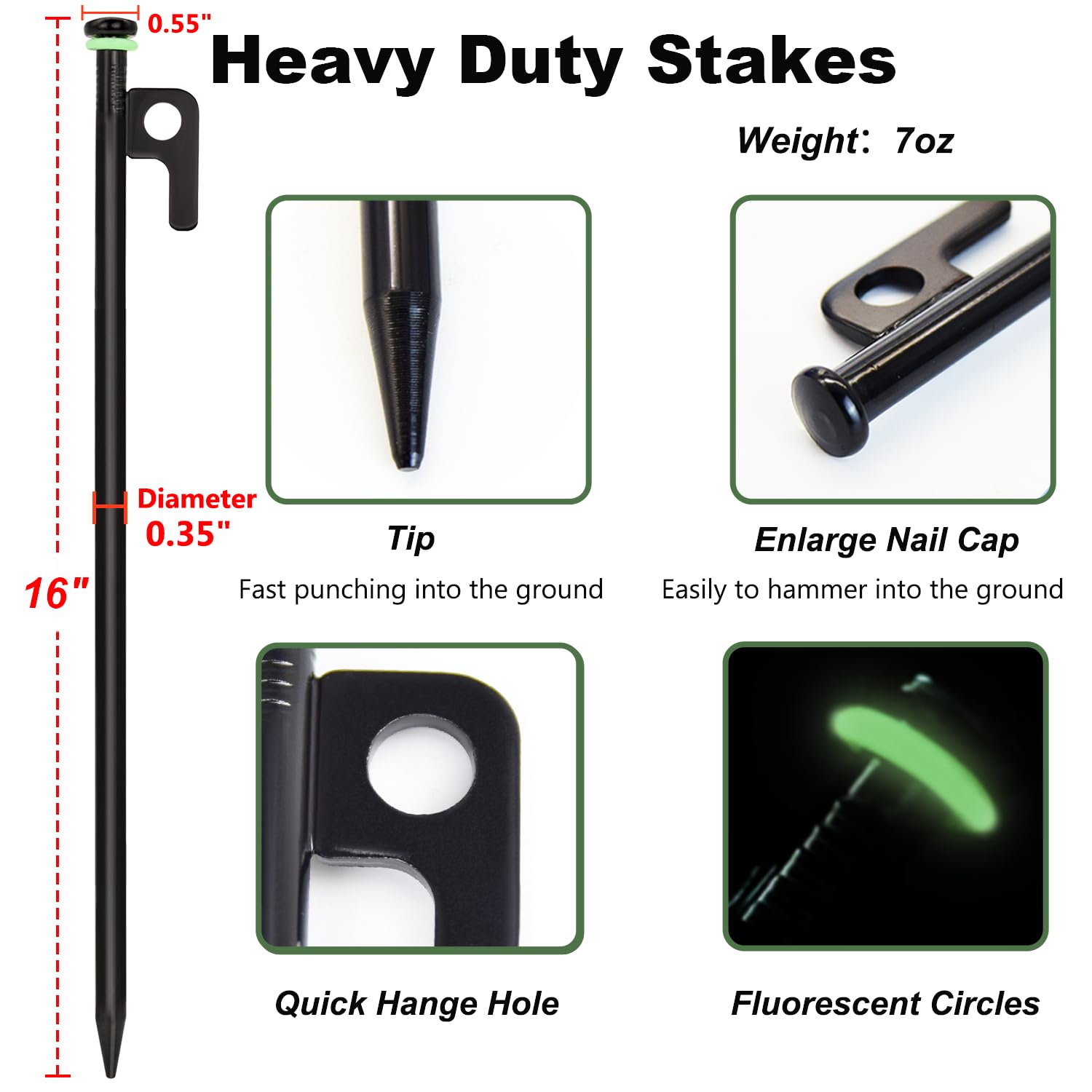 - 【Practical Design】Tent stakes feature a large flat head and sharp tip, they are easy to drive into hard soil and easy pull out with a hammer. The appropriate length (16in) will secure the tent securely