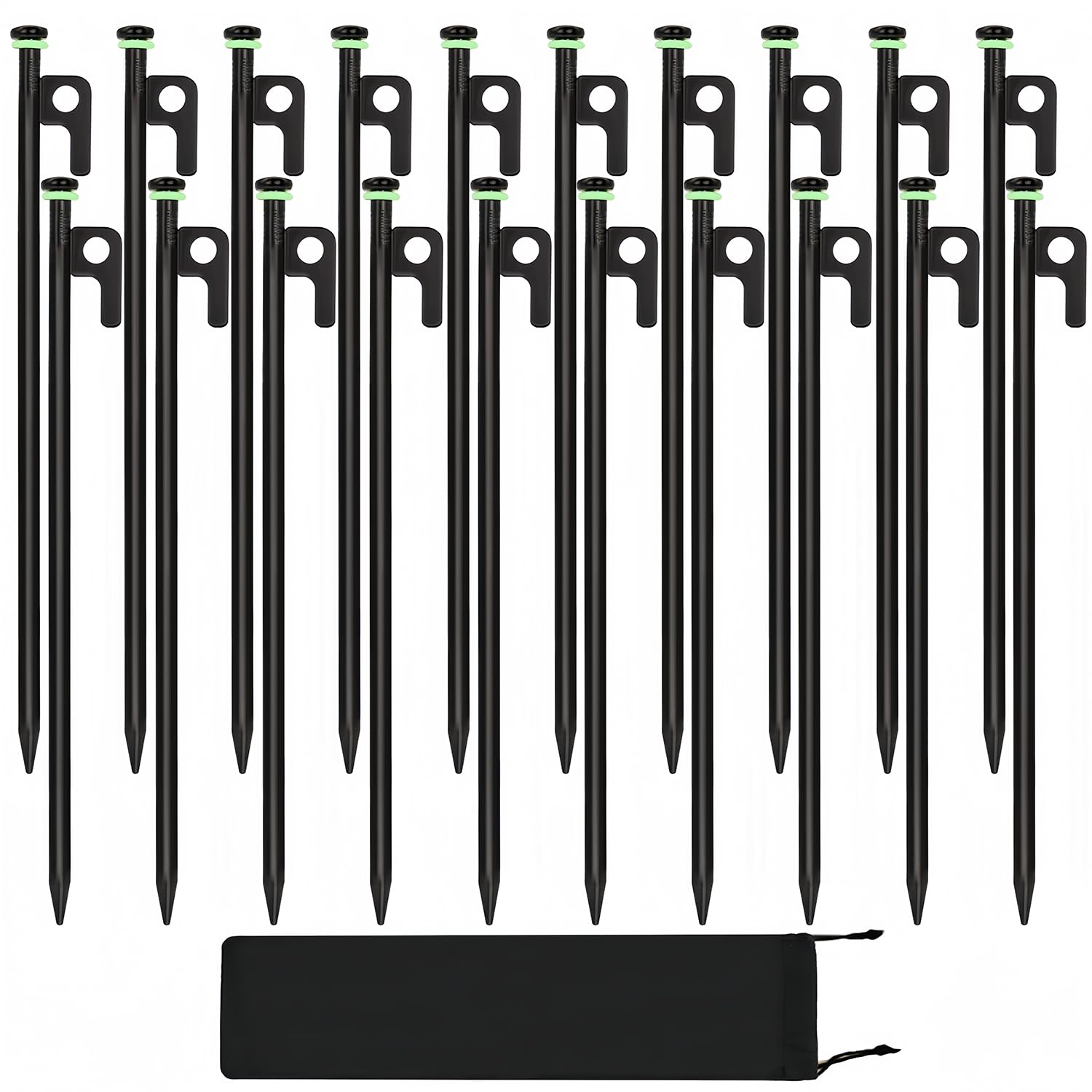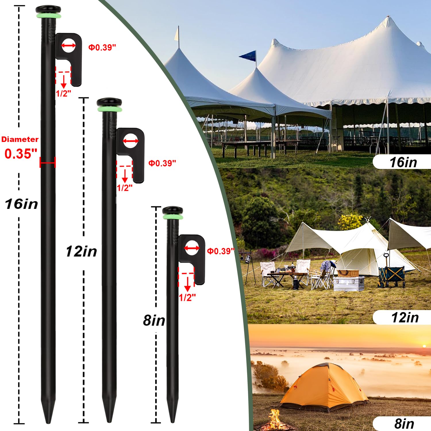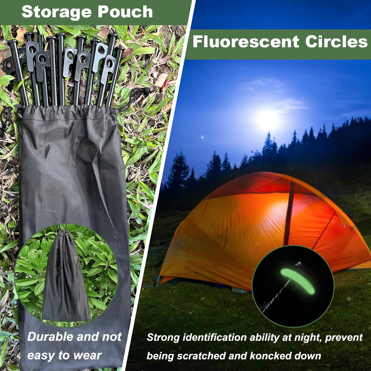 - 【Package Includes】Package come with 20pcs of 16in heavy duty stakes, 20pcs fluorescent rubber rings, 1pc storage pouch. The bulk quantity is enough to meet your multiple tent use and save your money