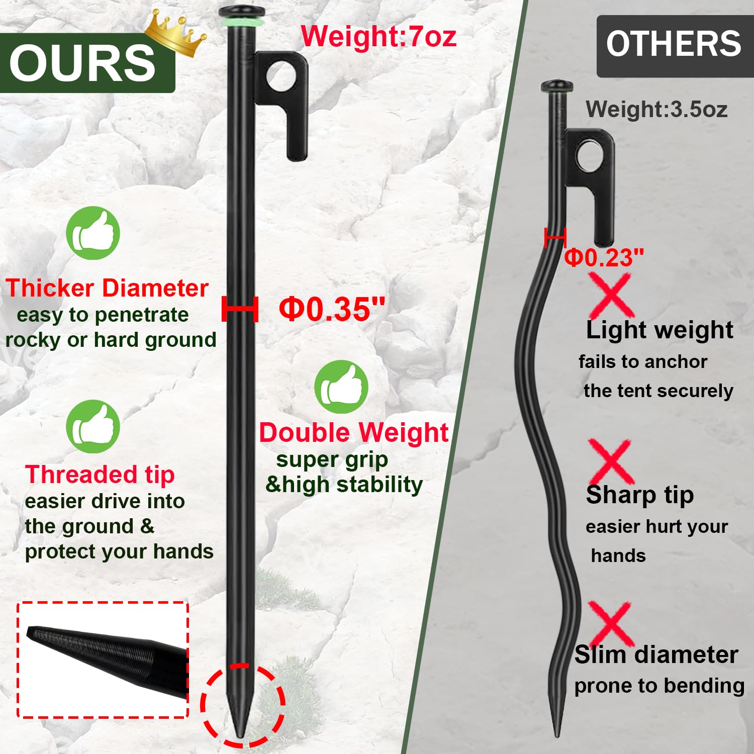 - 【Tent Stakes Heavy Duty】Our metal tent stakes are made of S45C forged steel, each diameter is 0.35in and weighs 7oz, which are long-lasting, resistant to breaking or bending, and works easily on hard or rocky surfaces. They are more stable and reliable to withstand strong winds